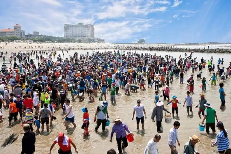 정확히 바닷길이 열리는 시각을 모르고 가다보니, 시간을 살짝 넘겨서 물이 들기 시작하는 때 도착했다. 미리 시간 맞춰 온 관광객들은 조개 등이 가득 든 작은 바께쓰를 들고, 주민들은 큰 들통을 들고 바닷길에서 나오고 있었다. 경운기 몰고 나오는 상인까지 보면서 신비의 바닷길을 지나쳐 호텔 비체 팰리스 앞 닭벼슬섬까지 갔다가 돌아왔다.