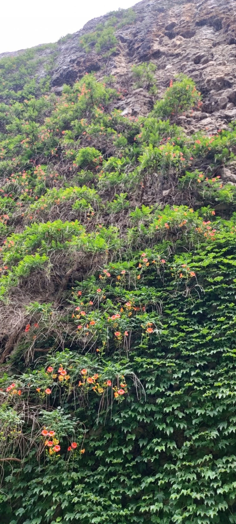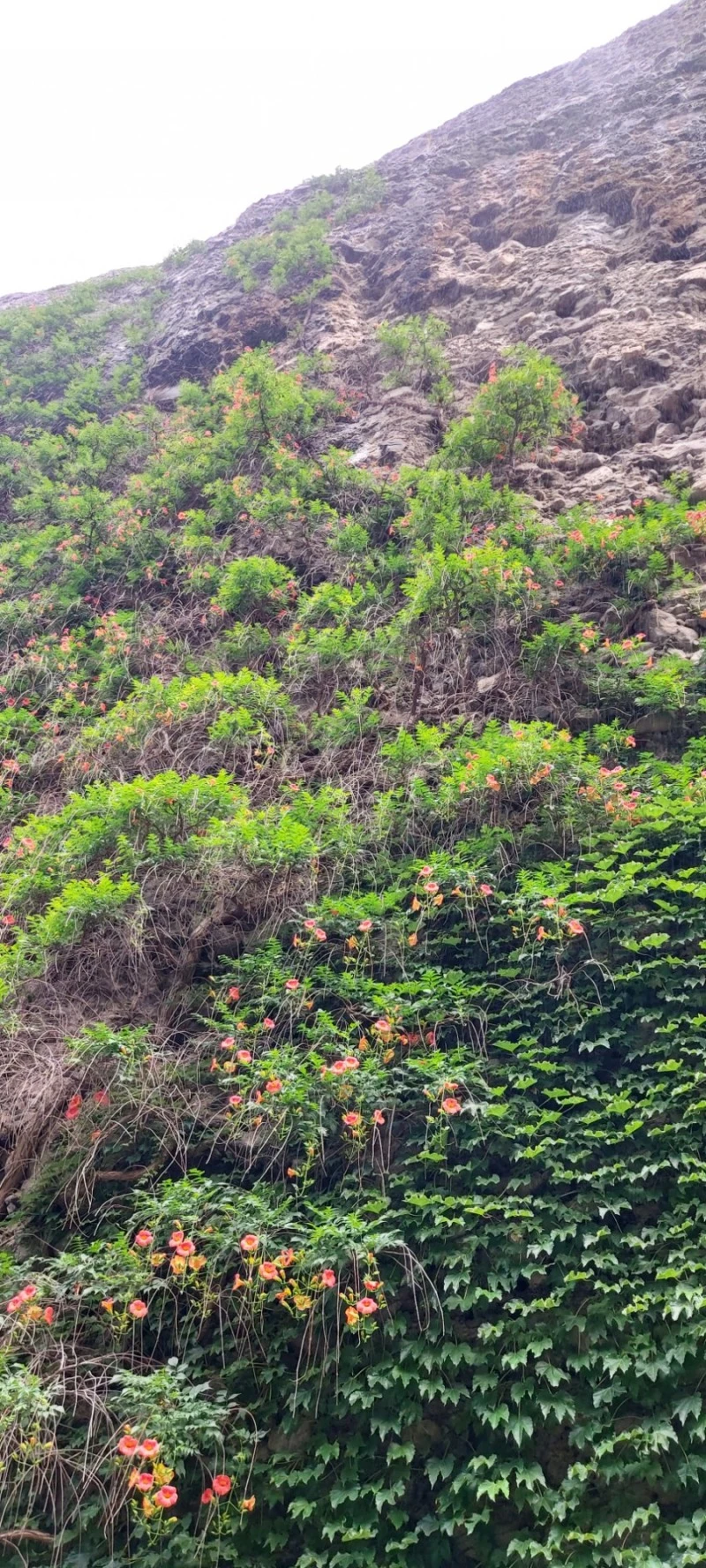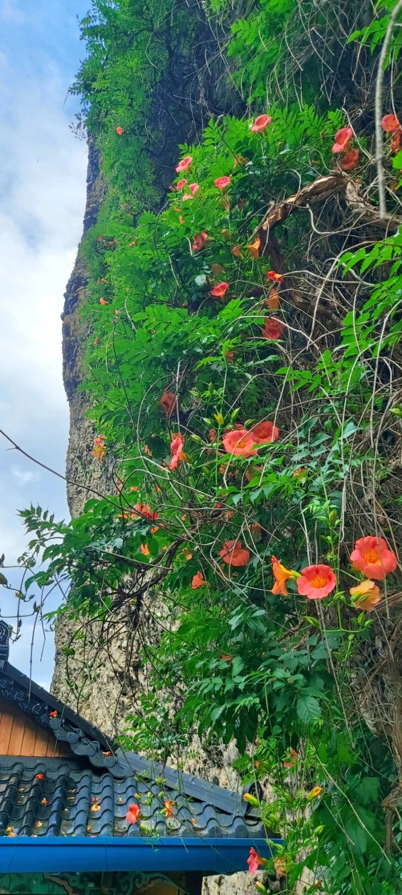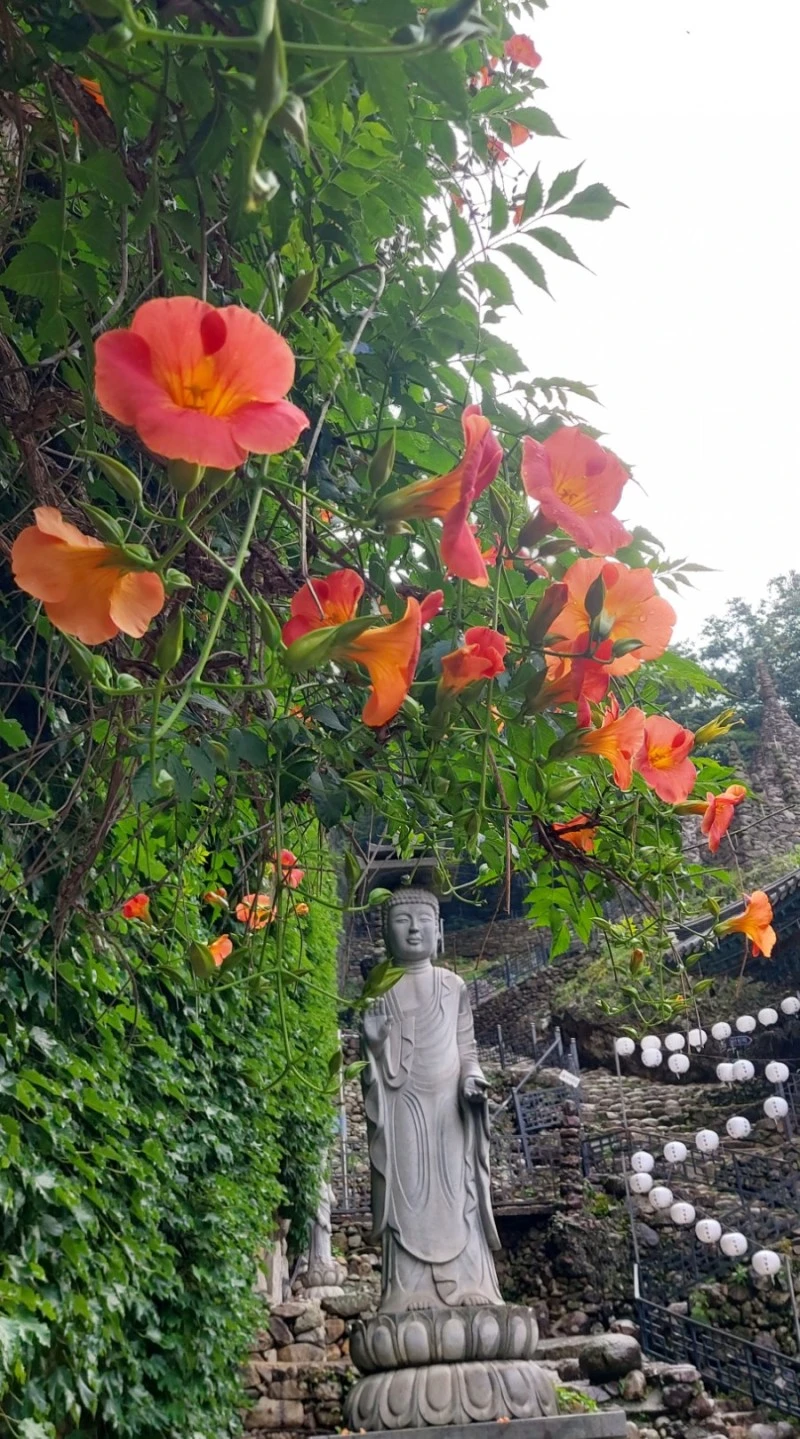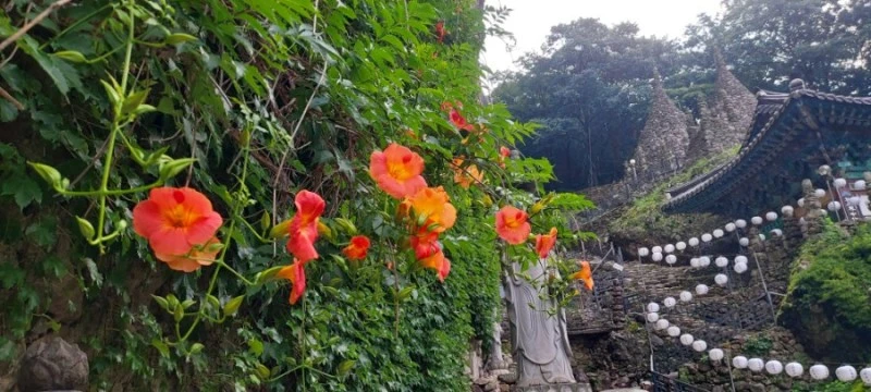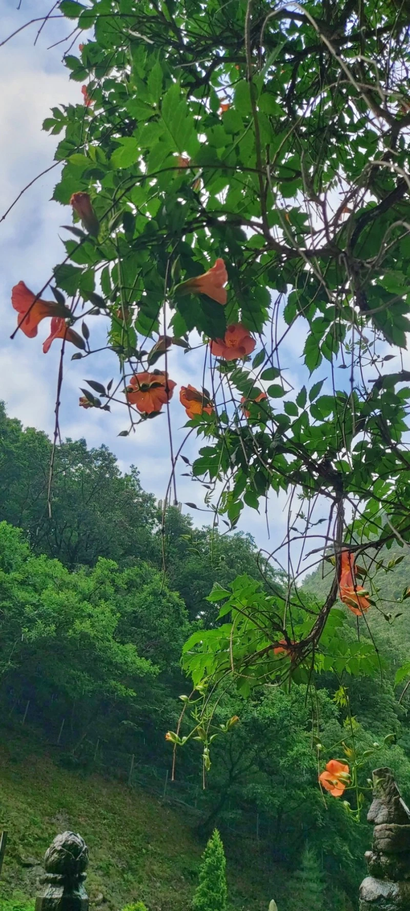 비가 많이 내려 능소화가 많이 떨어졌다니 만개한 풍경을 못 봐 좀 아쉽긴 했으나 그래도 활짝 핀 주홍빛 능소화를 실컷 볼 수 있었다. 벼랑에선 여전히 비가 후두둑 후두둑 떨어지는데, 숲사이로 해가 비치면서 파란 하늘이 드러나는 모습도 가히 장관이었다.