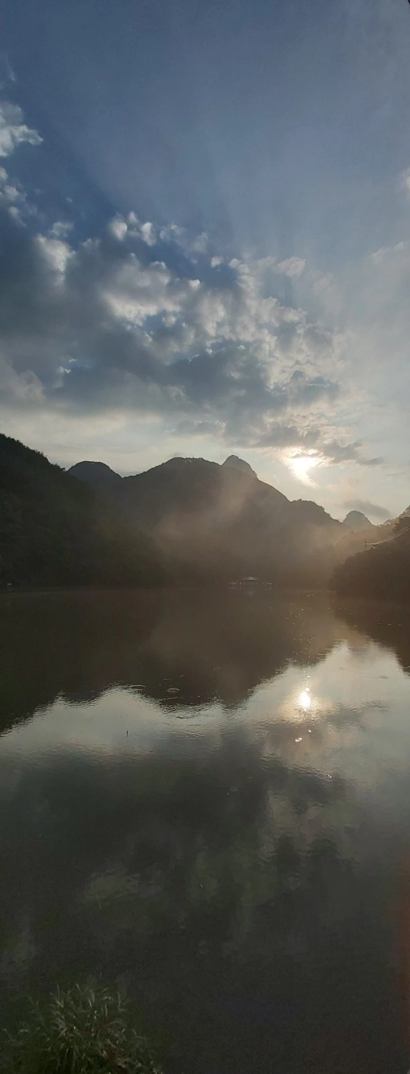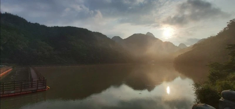 마이산 풍경에 취해있다가, 아차차! 얼른 다녀와야지~ 하구선 다시 출발. 마이산 나들목으로 나와서 마이산 입구로 가는데 밤새 내린 비로 세상 말끔하다. 어제 진안은 비가 많이 왔다고 한다. 부지런히 서두른 덕분에 탑사 앞 호수 '탑영제'에 해가 뜨는 장면을 포착했다.