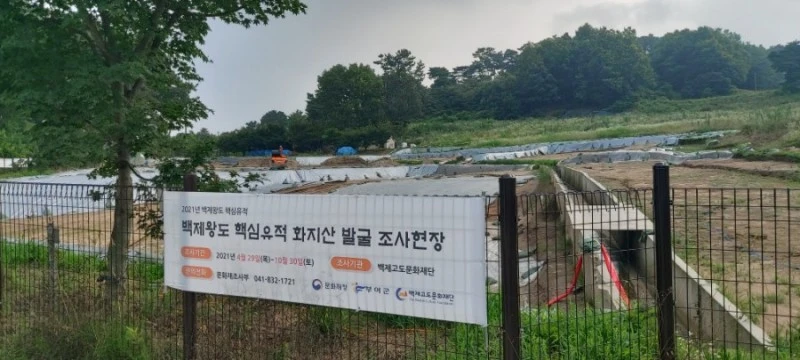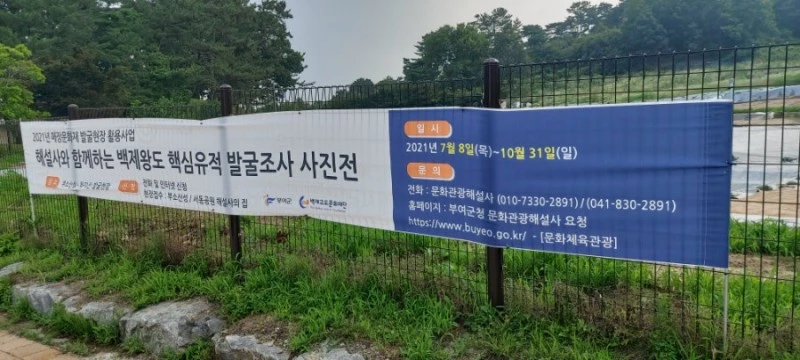동쪽끝에서 포룡정이 있는 궁남지 중심으로 돌아오면서 아까는 보지 못했던 연꽃들을 살피며 주차장으로 돌아왔다. 중간에 화장실을 가느라 주차장 바깥에 마련된 화장실로 가다보니, 백제왕도 핵심유적인 부여 화지산 유적 발굴현장이 있었다. 사진전도 하고 있고, 미리 신청하면 문화해설사의 설명과 함께 백제 유적들에 대해 공부할 수 있는 시간을 가질 수도 있으니 관심 있는 분들은 미리 신청하시길~