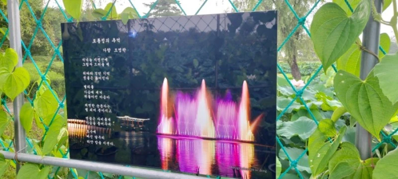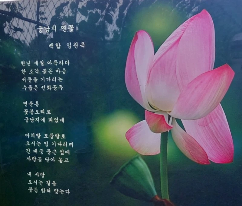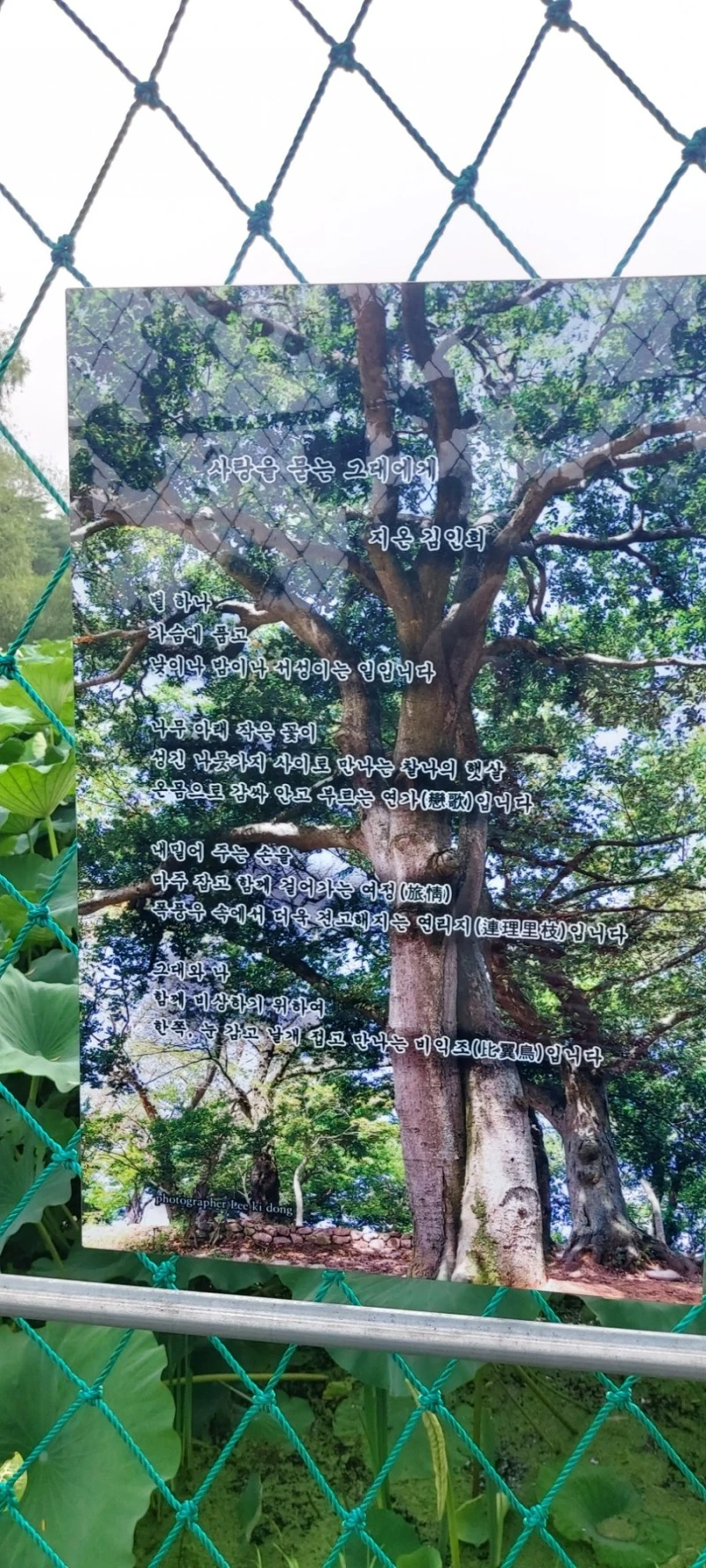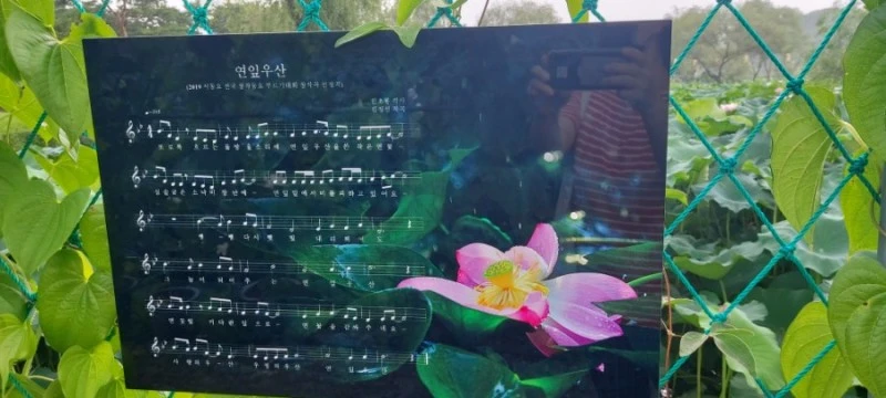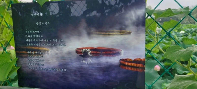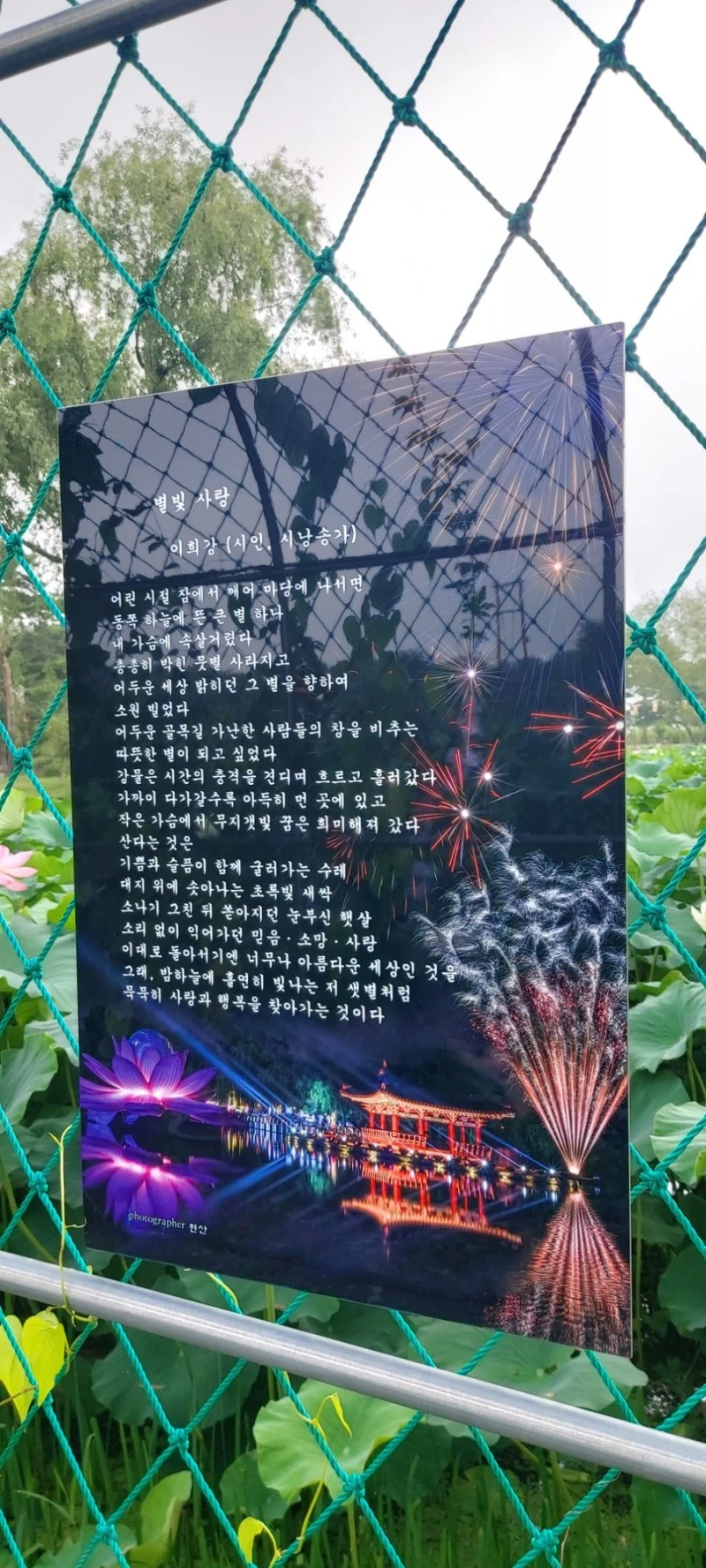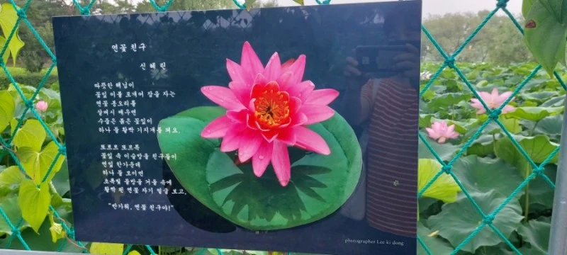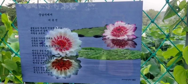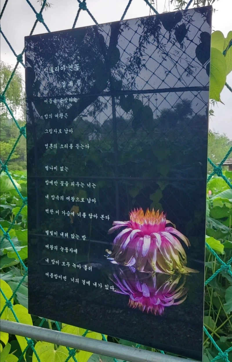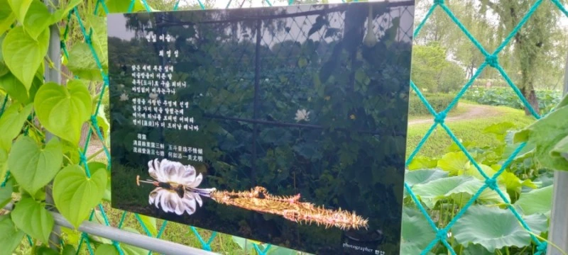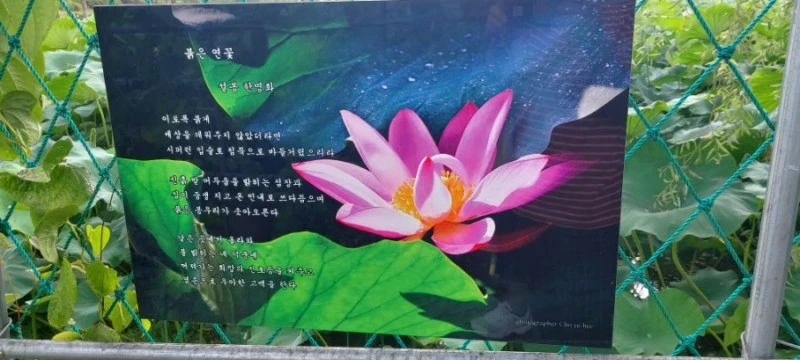 축제의 다른 프로그램은 다 취소되었지만, '시와 연꽃의 만남'이란 이름으로 마련된 시화전은 구경할 수 있었다. 아름다운 연꽃 사진에 곁들인 시들이 참 좋았는데 그중에 한 꼭지만 소개해본다.(나머지는 아래 사진에)