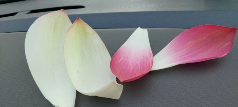 길을 걷다보니 홍연 꽃잎이 바닥에 떨어져있길래 주워서 연잎 위에 놓고 연출사진도 찍어봤다. 나중에 백련 꽃잎도 두 장 주워서 짝을 맞춰 대쉬보드에 놓고 기념촬영하고서 궁남지를 떠나왔더니, 연꽃향이 집까지 따라왔다.