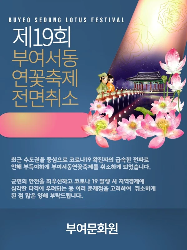 올해로 제 19회를 맞이하는 부여 서동연꽃축제는 코로나로 인해 취소되었다. 사회적 거리두기 4단계 격상을 논의하고 있는 차라 그간 열심히 준비해온 축제가 축제시작일인 7월 10일 토요일 하루 전에 취소발표가 났다. 원래대로 했다면 열기구 타고 사랑고백, 연지카누체험, 서동가족 선화찾기 챌린지, 리마인드 웨딩 등 다채로운 행사를 체험할 수 있었을 텐데 아쉽게 되었다.