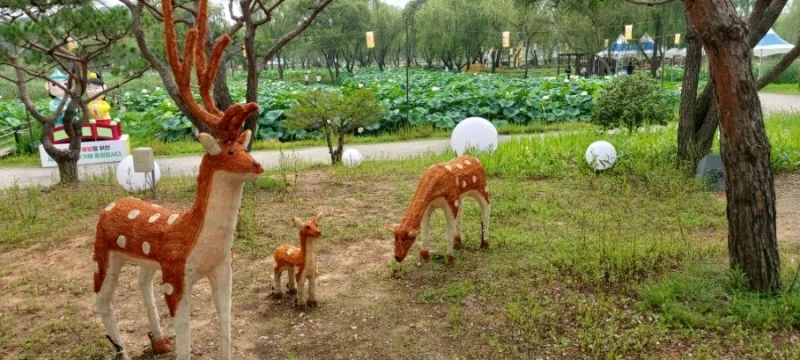 요즘 이게 유행인가보다. 가까이 가서 보니, 토끼도 있고 사슴도 있고, 부용꽃도 이제 막 피기 시작했다. 달조형물이 떠있는 연못엔 가시연이 있었는데, 아직 꽃을 피우진 않았다. 에고~ 아무래도 너무 빨리 왔어...ㅜㅜ