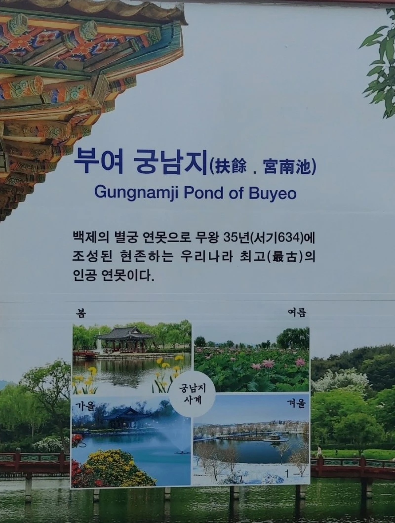 뛰어난 백제의 조경기술이 남아있는 부여 궁남지는 계절마다 다른 느낌이 연출되는 아름다운 연못정원이다. 7월에는 천만송이 연꽃들의 아름다운 향연인 서동연꽃축제가 열리고, 10~11월에는 다양한 작품으로 꾸며진 굿뜨래 국화전시회가 열려 궁남지의 아름다움을 더해준다.