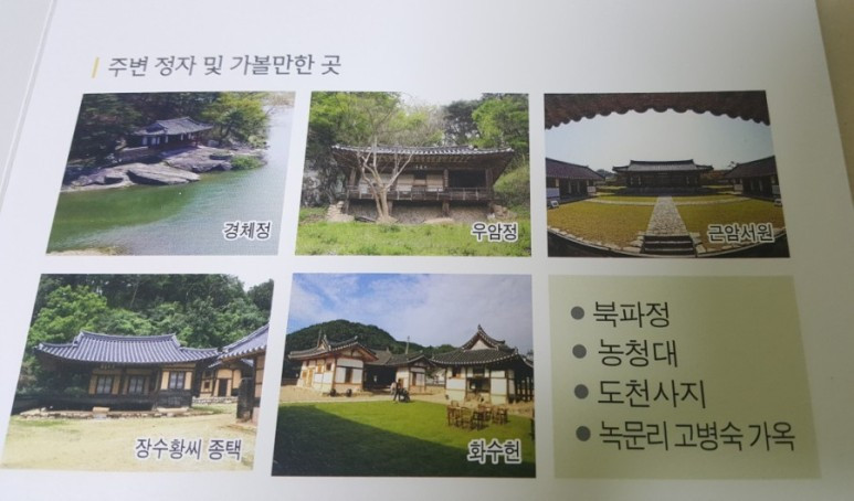 주암정이 있는 마을인 웅창은 나라에서 관리하던 곡식창고가 있었기에 붙여진 이름이다. 이 마을은 조선시대에 인천 채씨들의 집성촌인 이웃 산양면 현리마을과 함께 유교문화가 크게 융성한 곳이었다고 한다. 그래서 그런지 주암정 좀 위에 우암정, 바로 건너에 경체정과 화수헌, 아래에 북파정과 녹문리 고병숙 가옥, 그 건너에 농청대, 현리로 쑥 들어가서 양파정, 큰 길 건너에는 근암서원, 안동 김씨 부훤당고택, 400년 이상된 탱자나무로 유명한 장수 황씨 고택 등 유교문화를 보여주는 건물들이 즐비하다. 이들이 모두 걸어서 갈만한 지근거리에 다 있다!