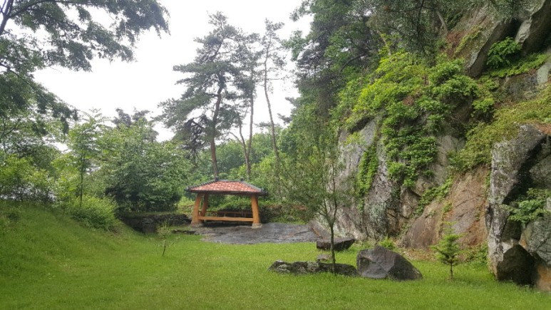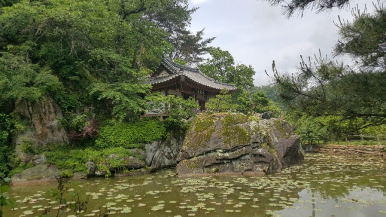 정자 앞에는 동그마한 연못이 있고, 그 주변을 휘돌아 개울이 흐르는데 정자 옆에 난 작은 나무문을 통과하면 암벽 아래 정자가 있다.