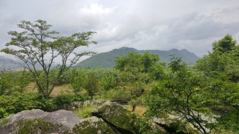 쏟아지던 비는 슬슬 멈춰가고, 막 모내기를 끝낸 앞논에는 가까운 산그림자가 비치고 있었다.