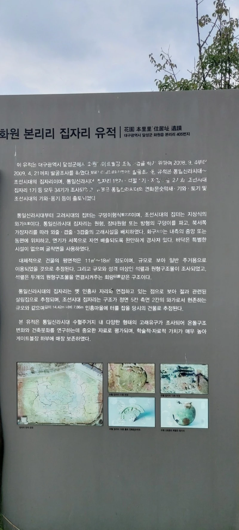 이번엔 비슬산 둘레길로 올라가는 후문쪽 주차장에 차를 댔다. 뒤에서부터 들어가며 새로운 눈으로 보고 싶은 마음에 그리 했는데, 그러길 잘 했다. 지난 번에는 놓쳤던 여러 풍경들을 사진에 담을 수 있었다. 세거지 바로 옆에는 통일신라부터 고려시대까지의 집자리 유적이 있는 큰 공터가 있다. 지금도 발굴중이다.