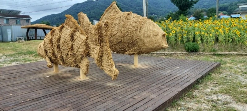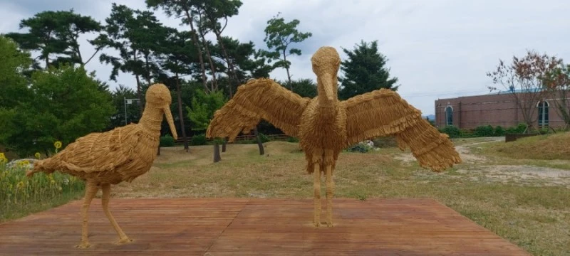 전에는 못 보았던 짚으로 만든 조형물이 있는 곳으로 제일 먼저 가보았다. 예산의 상징물인 황새와 물고기상이 짚으로 만들어져있었는데, 가까이서 보니 진짜 짚이 아니라 짚처럼 생긴 비닐이었다.