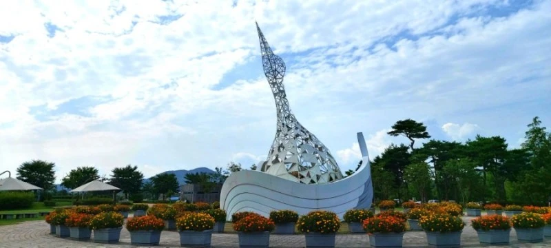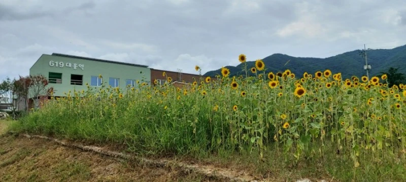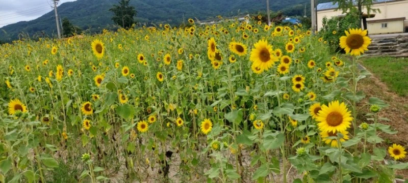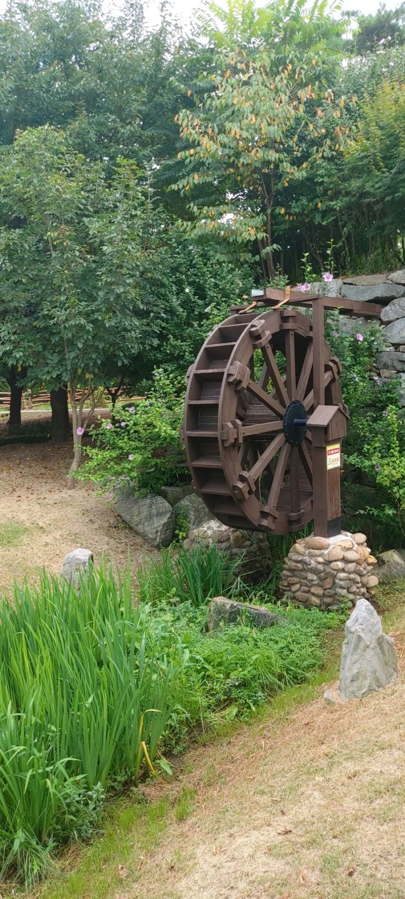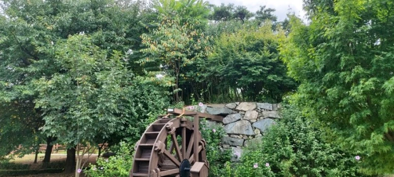 어머님께서 연신 감탄하시며 조형물을 만져보시고, 돌아보시고 하며 구경하다가 물레방아가 있는 공원 아래로 내려갔다. 가면서 보니 여기는 최근에 새로 생긴 '우애화원'이란 곳이었다. 해바라기밭도 한쪽에 조성해놨는데, 얼마 전에 심었는지 키가 그닥 크지 않고, 꽃도 작았다.