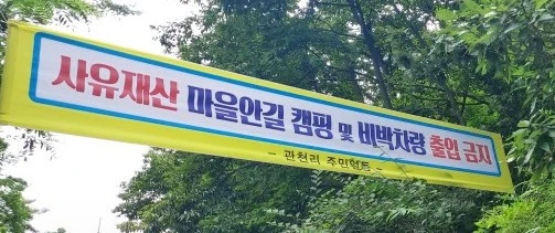 사람들이 하두 몰려들어 마을 주민들이 힘드셨는지, 마을 입구부터 마을 안길 통행금지, 차박/비박 금지 현수막이 곳곳에 걸려있고, 마하산 중간에 통행금지용 쇠줄을 두 가닥 걸쳐놓은 것도 모자라 길 중간중간 수로 위에 놓인 쇠망틀마저 다 들어내서 길이 끊어져 어지간한 차로는 절대 올라갈 수 없겠더라구요. 혹시나 고집 피우고 차로 돌진하시다가 길 중간에서 오도 가도 못하는 빼박 상황이 연출될 수 있겠더군요.