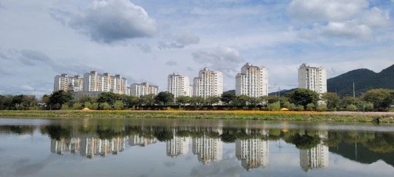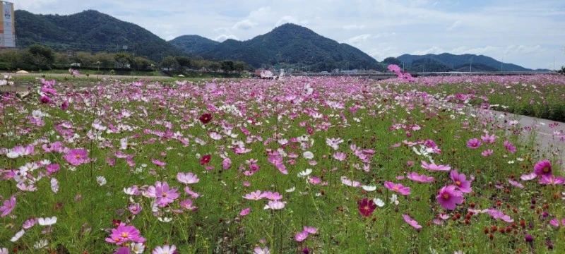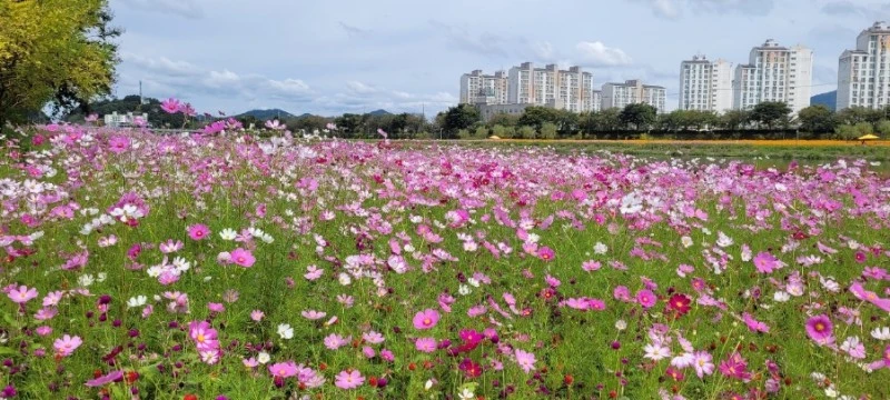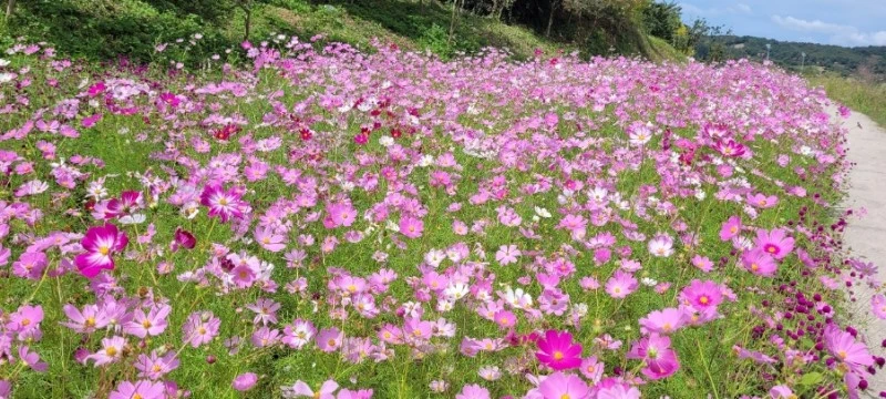 황룡강에 코스모스와 천일홍, 노란코스모스가 활짝 펴 색색으로 물결치는 가운데 유난히 파란 하늘에 하얀 구름이 빛나는 푸르른 가을날이었다.