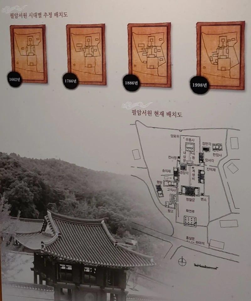 전체적으로 보아 필암서원은 여느 서원과 마찬가지로 교육 공간이 앞에, 제향 공간이 뒤에 놓이는 전학후묘(前學後廟)의 배치를 보인다. 하지만 필암서원과 청절당의 편액이 확연루를 바라보는 남쪽에 있지 않고 북쪽을 향하고 있는 점과, 원생들이 기거하는 재실이 청절당 안마당에 자리한 모습이 다른 서원과 달라 궁금증을 자아냈는데 친절하신 문화해설사 선생님 덕분에 그 이유를 알게 되었다.