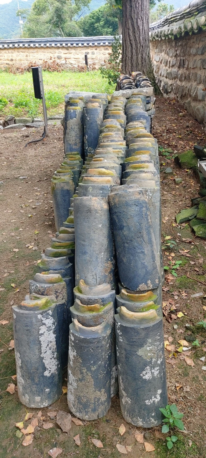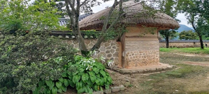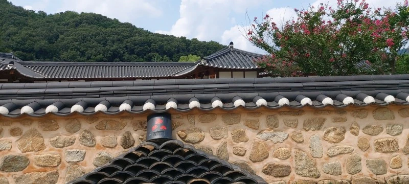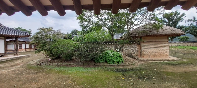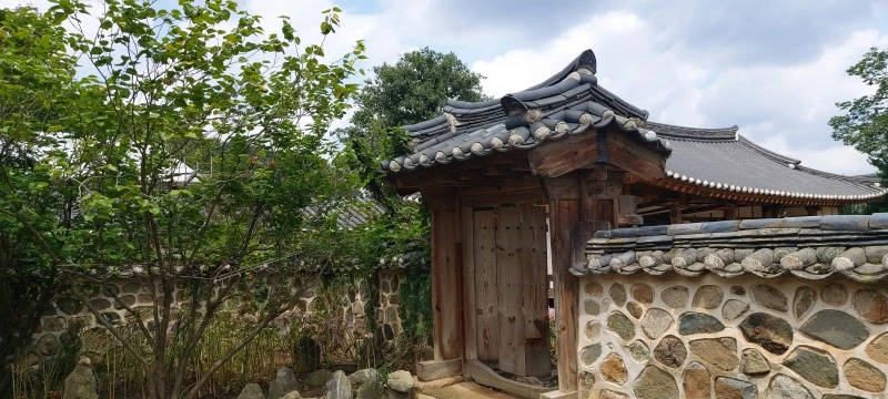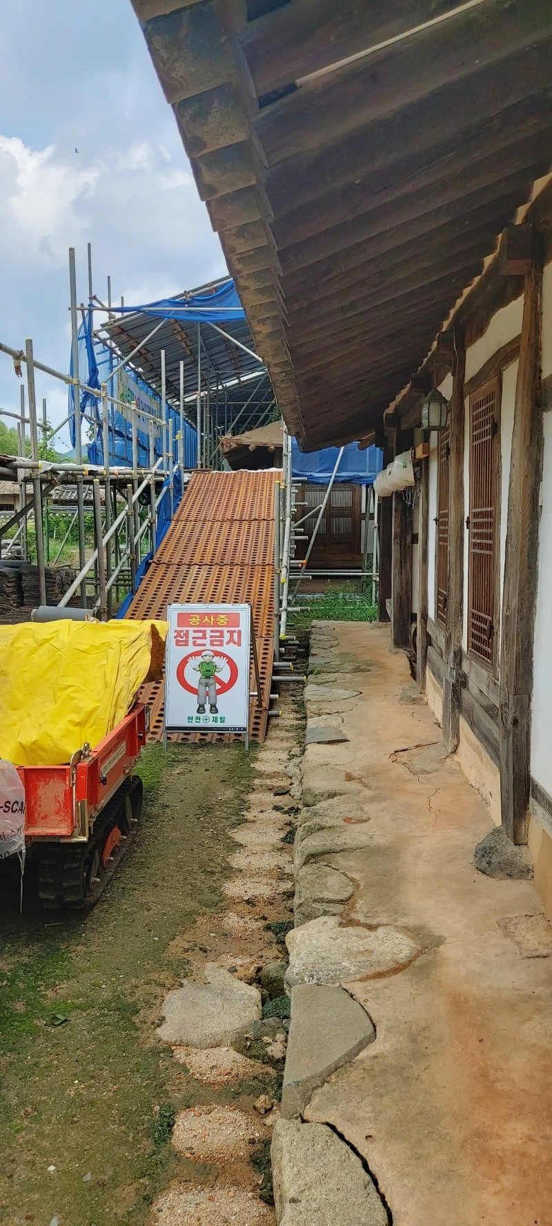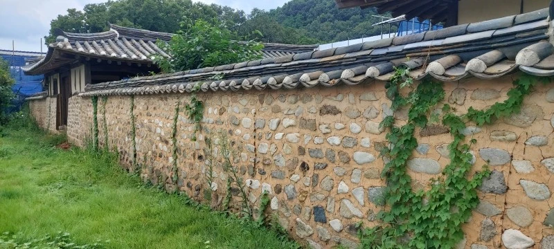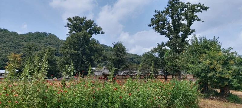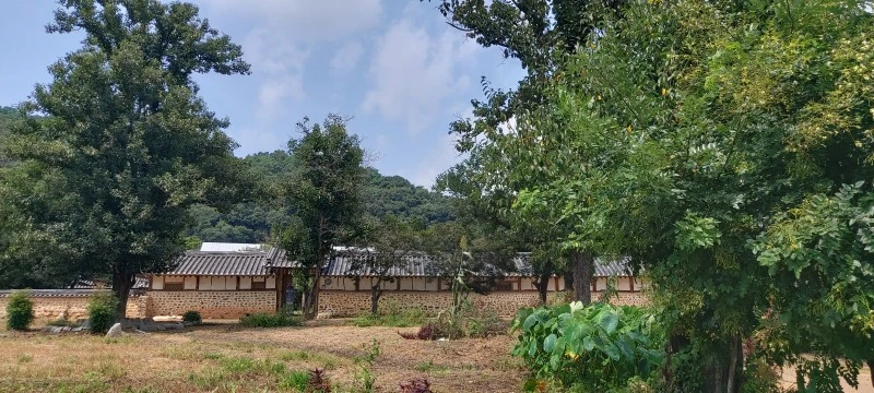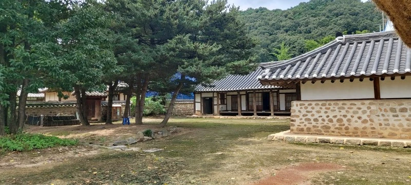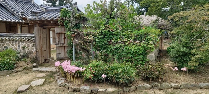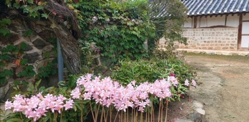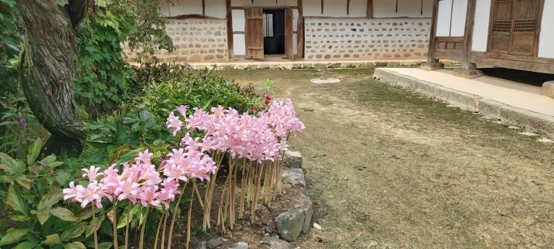 그러나 입구에 있는 한옥스테이 앞에 기와에 그린 그림이라든지 사랑채 마당에 분홍빛으로 피어난 상사화가 한옥의 멋과 운치를 살려주었다. . 9월엔 초록이 무성했던 고택을 둘러싼 나무들이 지금쯤 노랑빨강으로 단풍이 들어 더욱 아름답지 않을까 기대된다.장막을 치고 보수공사중이던 안채도 볼 수 있을 테고.