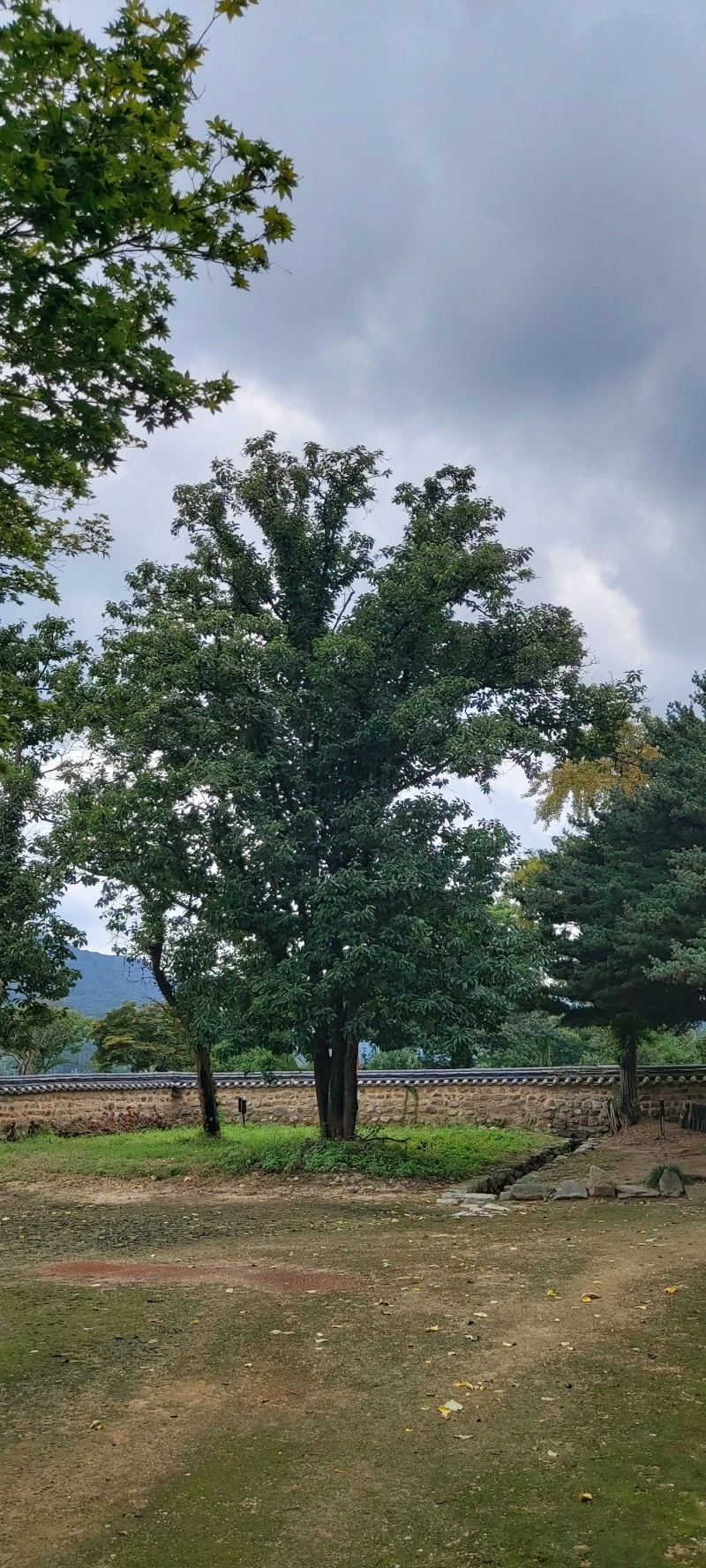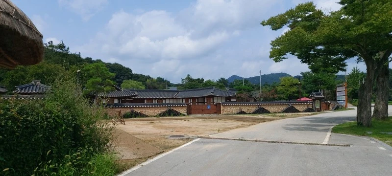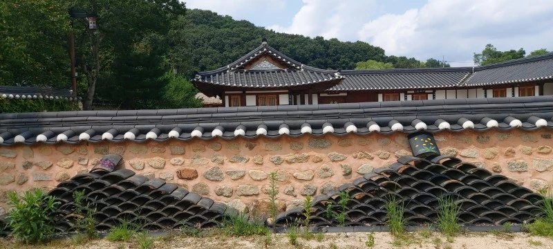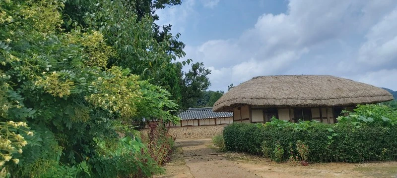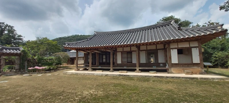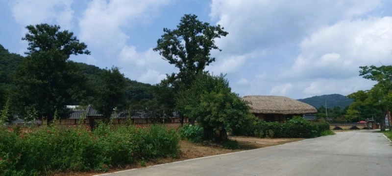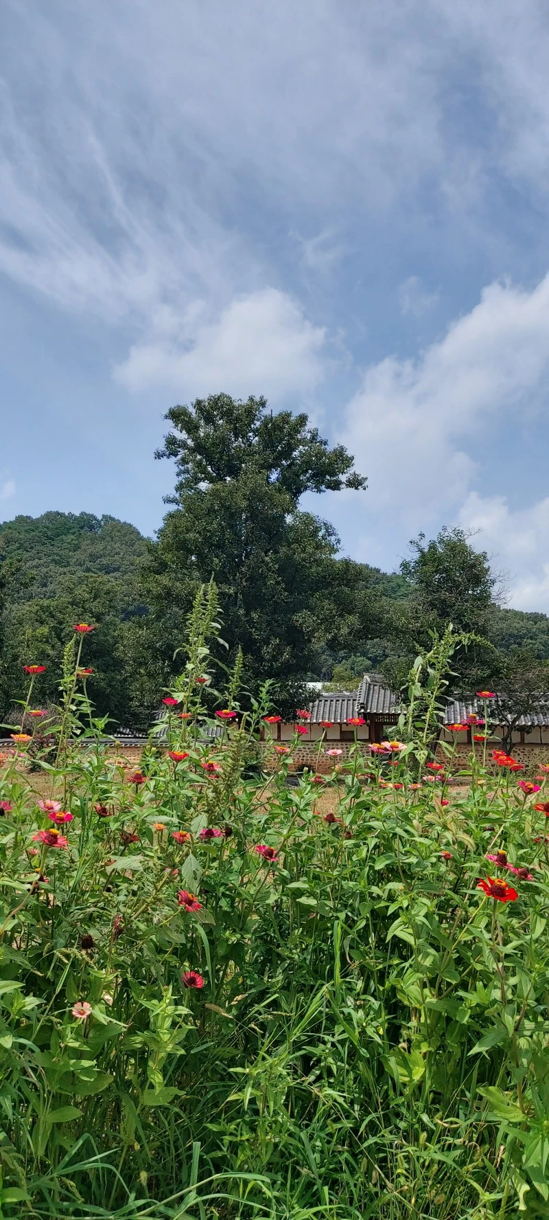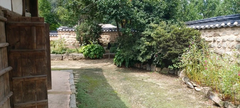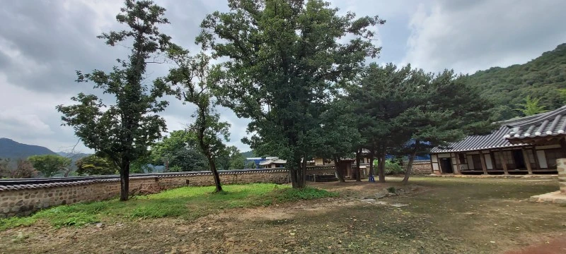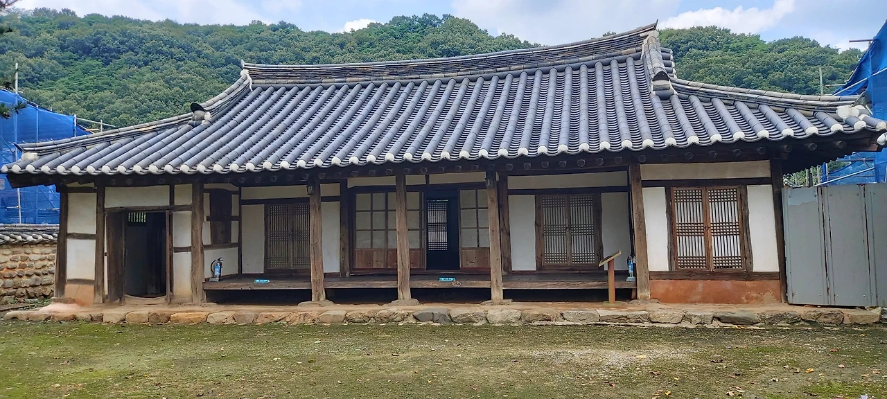 그러나 입구에 있는 한옥스테이 앞에 기와에 그린 그림이라든지 사랑채 마당에 분홍빛으로 피어난 상사화가 한옥의 멋과 운치를 살려주었다. . 9월엔 초록이 무성했던 고택을 둘러싼 나무들이 지금쯤 노랑빨강으로 단풍이 들어 더욱 아름답지 않을까 기대된다.장막을 치고 보수공사중이던 안채도 볼 수 있을 테고.