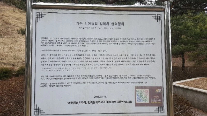 (이 표지판은 제천의병유족회와 민족문제연구소 제천단양지회에서 만들었으나 이를 노래비 옆에 세울 수 있도록 허락한 제천시의 역사의식에 박수를 보냄)
