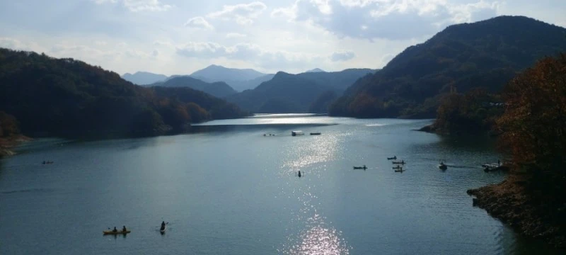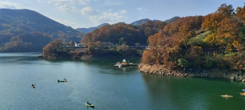 그리고 다리 가운데 부분 10m? 정도만 강화유리로 되서 아래 청풍호가 내려다보이고, 다른 곳은 다 나무데크로 막아놓아서 다리를 건너며 아래의 물을 쳐다보는 맛도 없어 아쉬웠다. 출렁다리 건너기 전 옥순대교가 보이는 광장에서 주변풍경을 둘러보는 게 더 좋았다.