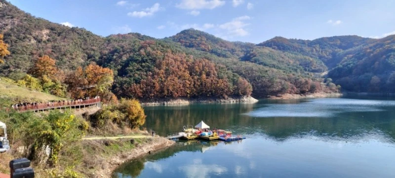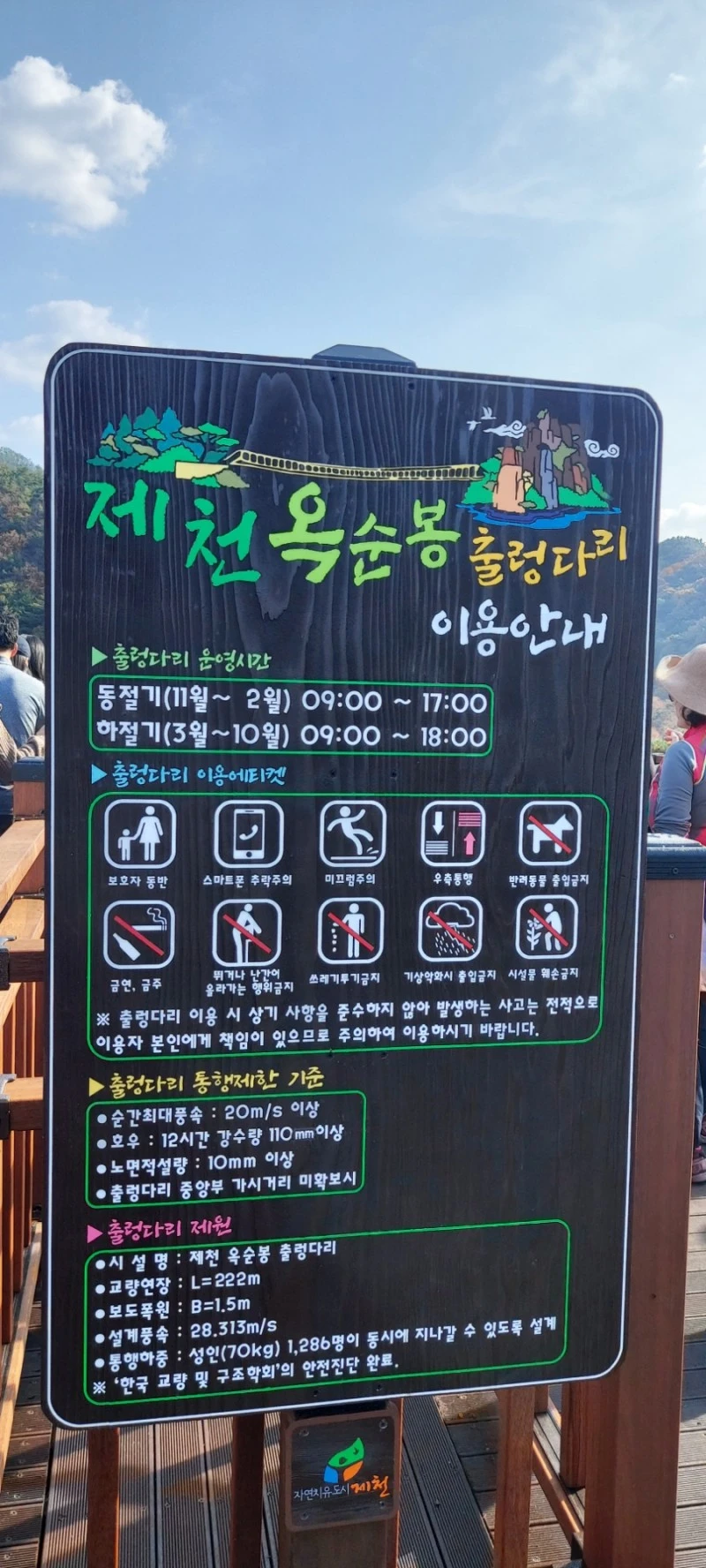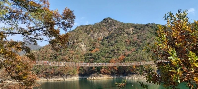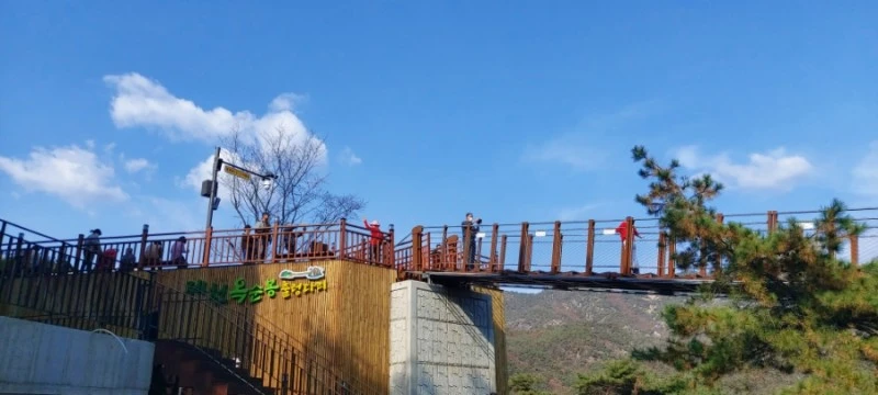 출렁다리에 입장할 때도 입구에서 인원체크를 하긴 하는데, 특별히 인원제한을 두지 않고 그냥 다 들어가게 하고 있었다.(통행하중은 성인 70kg 기준 1286명까지 가능하다고 되어있다) 다리폭이 1.5m라서 겨우 두 사람이 통과할 정도로 좁은데 사람들이 너무 많이 다리 위를 걷다보니 다리가 위태위태하게 출렁거려서 스릴감은 가히 압도적이었다. '이러다 다리 끊어지는 거 아냐?'하는 생각이 들 정도로 꽤 많이 흔들렸다. 어떤 애엄마는 출렁다리 안전난간을 붙잡고 바들바들 떨면서 걸으며 "아, 망했어~ 이거 어떻게 가?"하면서도 꿋꿋이 가던데, 스릴감을 즐기고 싶다면 옥순봉 출렁다리가 짱이다.