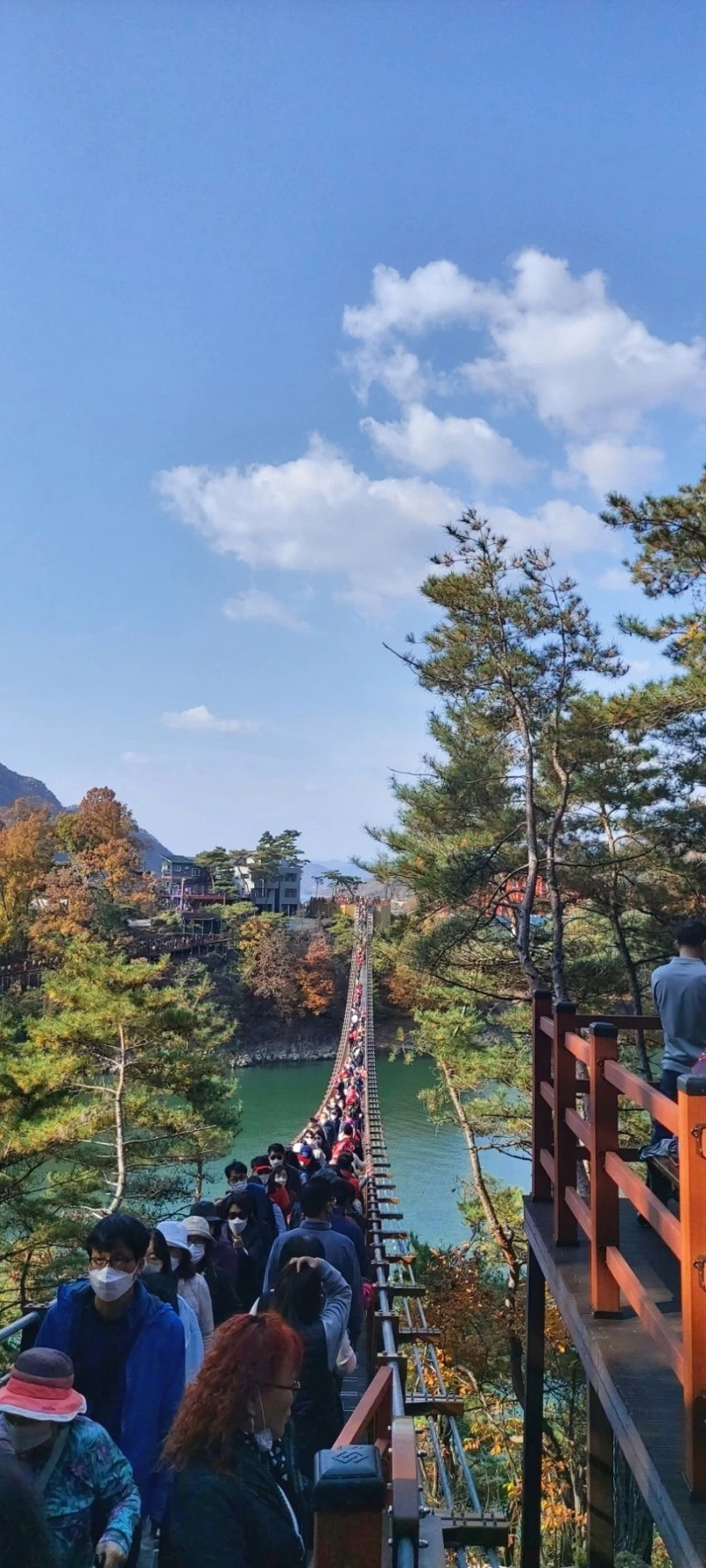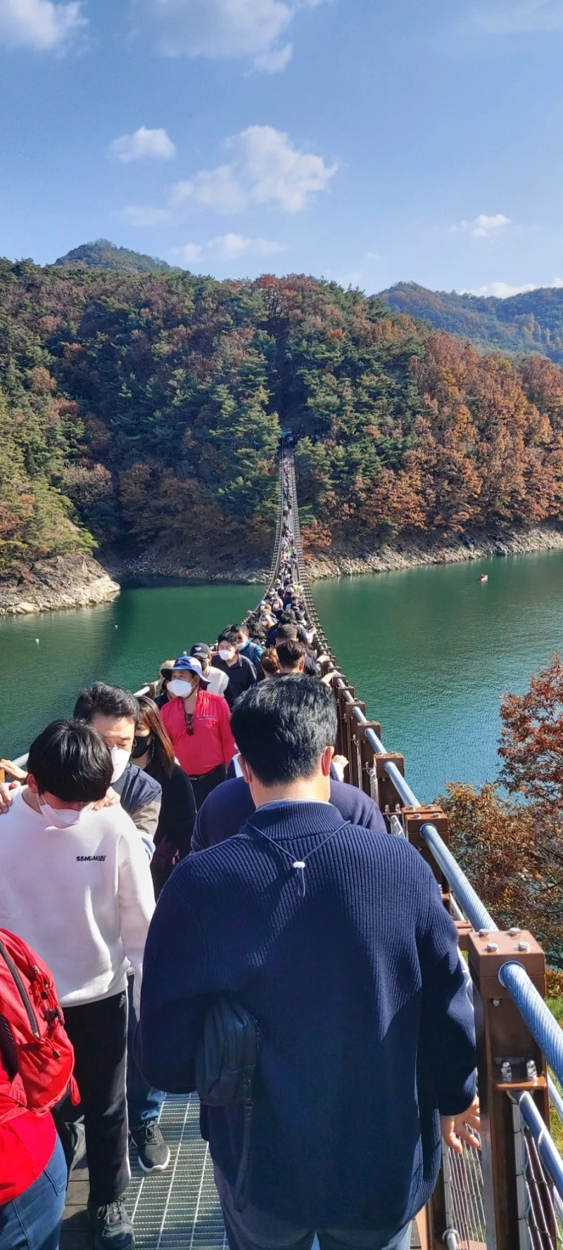 사람에 떠밀려 정신없이 오가면서 주변 풍경을 보자니, 아무래도 여유있게 볼 짬도 없고 너무 흔들려서 사진을 찍기도 쉽지 않았다. 10월 한글날에 다녀온 채계산 출렁다리보다 겨우 48m 짧은 222m 다리를 순식간에 건너버렸고, 너무 사람이 많아 한 번 더 건너보고 싶다는 생각도 들지 않았다. 내년 4월에 유료화된 이후에나 좀 한가해지려나...