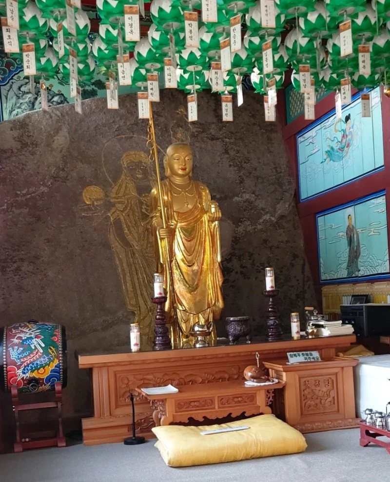 산길 아래쪽으로 내려가야 보이는 지장전에 모셔진 마애지장보살입상이 상당히 특이하다. 원래 암벽이 있던 곳에 그대로 암벽을 또 하나의 벽으로 하여 법당을 지었는데, 지장보살입상 뒤에 있는 암벽에는 금칠로 그려진 또다른 지장보살이 있다.