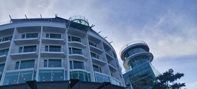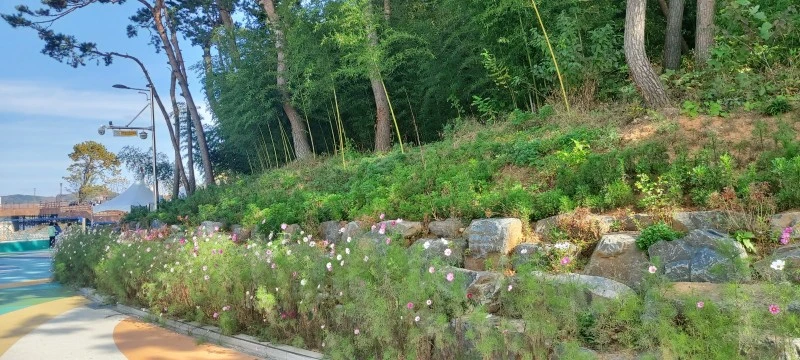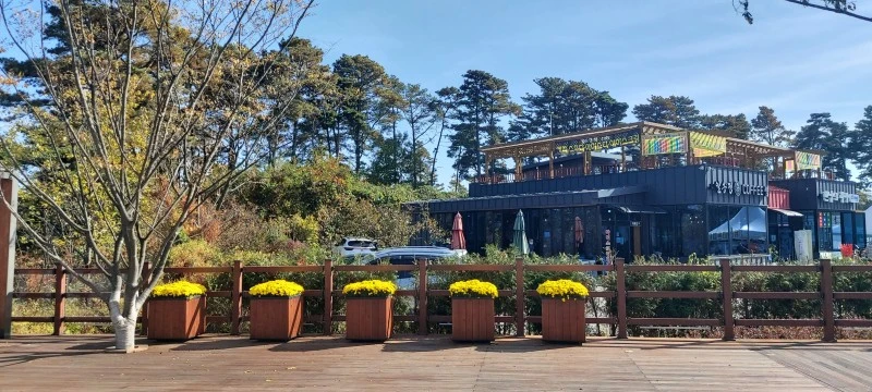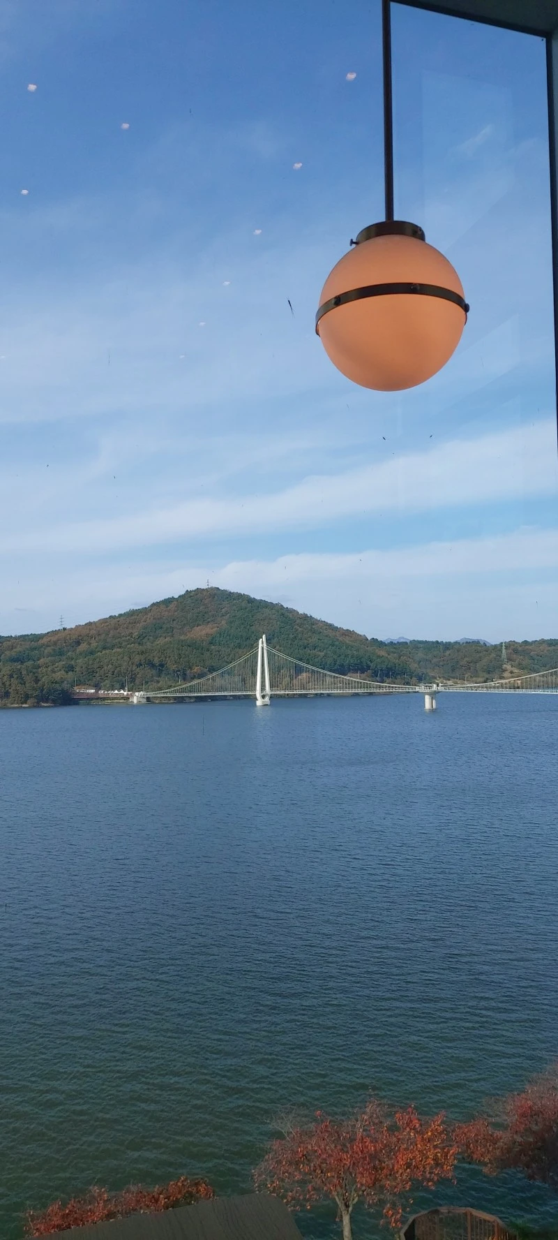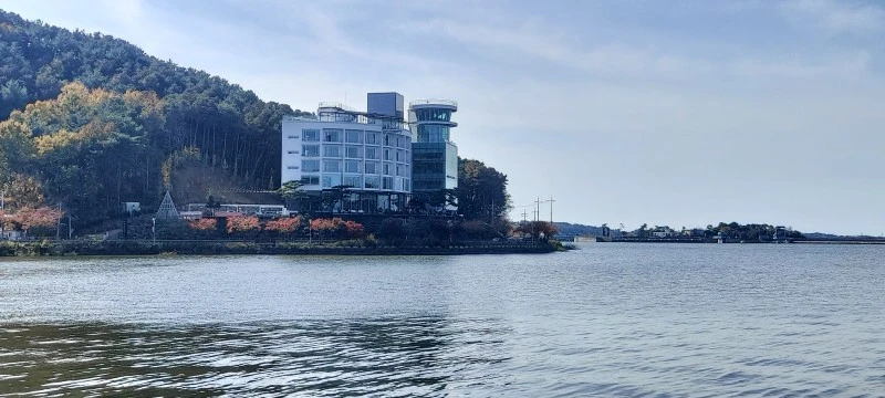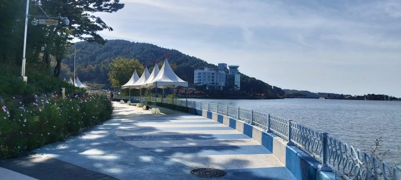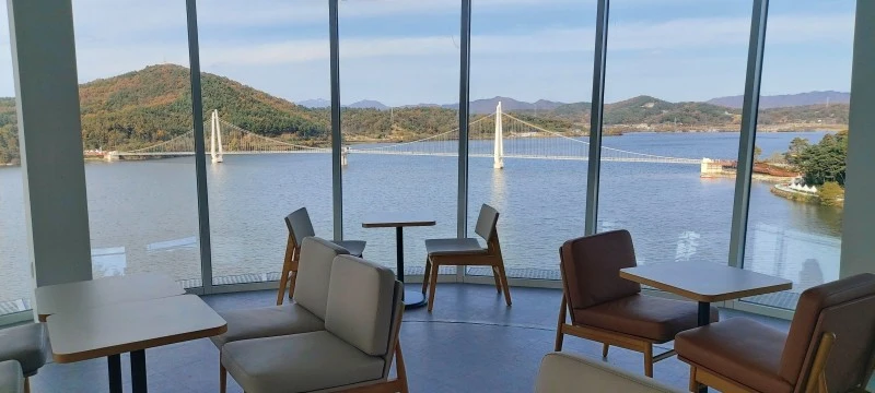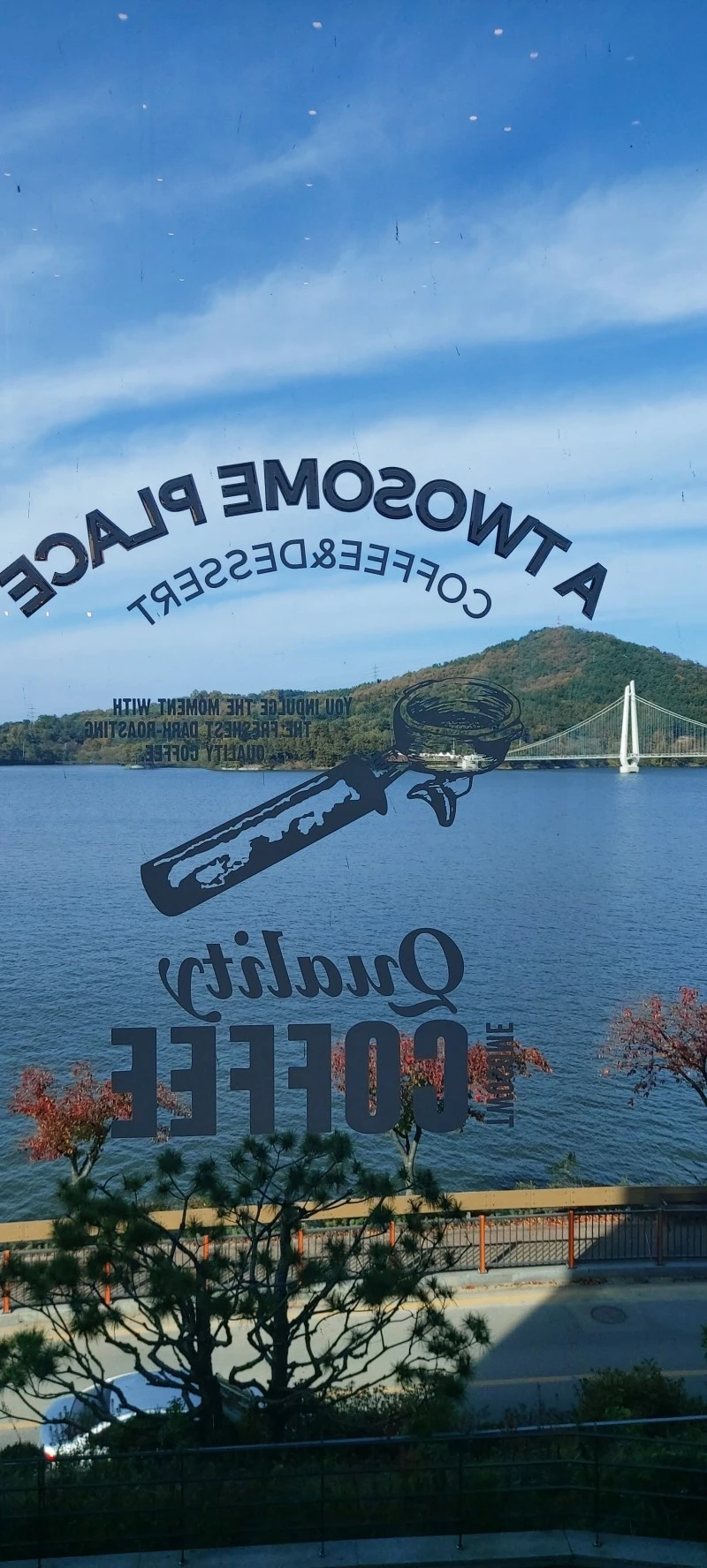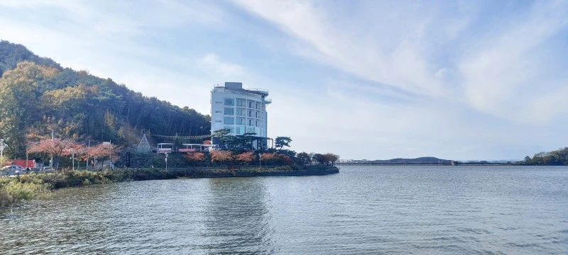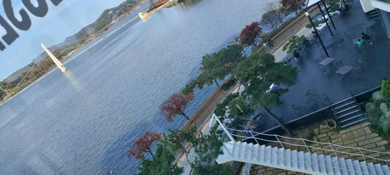 남문쪽에 다다르니, 예전에 식당이었던 일송정이 카페로 재단장해서 사람들이 가득했고, 광장을 지나 아직도 피어있는 코스모스길과 붉은 단풍나무 가로수가 있는 수변길을 따라 가니, 탑정호 둘레를 도는 셔틀버스 승강장과 새롭게 생겨난 카페들이 보였다. 우린 건물이 높아서 한눈에 탑정호와 출렁다리를 내려다볼 수 있는 레이크힐호텔 옆의 '투썸플레이스'에서 티타임을 가지며 탑정호를 즐겼다.
