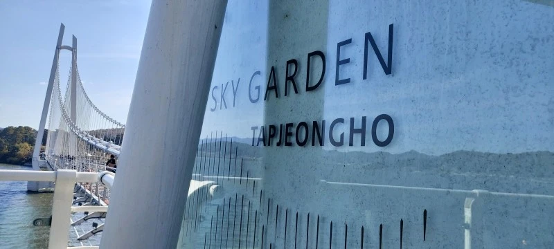 출렁다리를 건너려면 각각 북문과 남문에 있는 입구에서 들어가야 하는데, 북문에서 건너가며 보는 풍경이 더 멋지다. 360도 열린 전망이 오른쪽으로는 얕은 산 아래 탑정호 수변데크길과 음악분수가 보이고, 왼쪽으로는 대둔산과 계룡산을 비롯한 크고 작은 산들이 가을단풍에 물들어가는 모습이 펼쳐진다. 다리 폭이 넓어서 여유롭게 풍경감상이 가능했고, 다리가 많이 흔들리지 않아 안정감이 있었으며, 다리 아래를 들여다볼 수 있게 해둔 쇠철망도 일자형이 아닌 마름모꼴이어서 휴대폰이 빠질 염려도 없었다. 무엇보다 다리 곳곳에 혹시나 사람이 물에 빠졌을 때를 대비해 구조용 튜브를 설치해놓은 점도 마음에 들었다. 출렁다리 중간쯤에는 쉬어가면서 주변을 천천히 둘러볼 수 있도록 '스카이가든'이란 쉼터를 만들어놓아서 다리쉼을 하며 풍경을 감상할 수 있다.