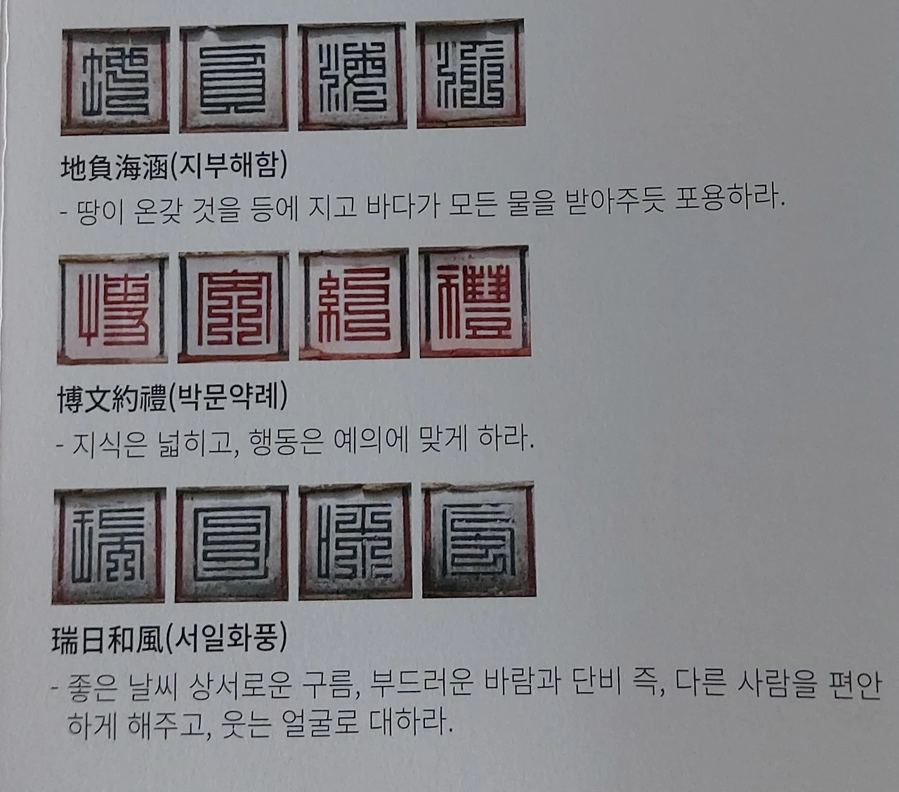 博文約禮(박문약례) : 지식은 넓히고 행동은 예의에 맞게 하라. [풀이] 배움을 통해 지식을 확장하면서도 자만하지 않고 예에 맞게 말과 행동을 절제할 수 있다면 참다운 도로 나아갈 수 있을 것이다. 배움의 참뜻을 구현한다는 것은 단순한 지식의 축적과 활용뿐만 아니라 예법에 맞는 예의 실천을 위한 자기 수양이 함께 갖추어야 한다는 의미이다.