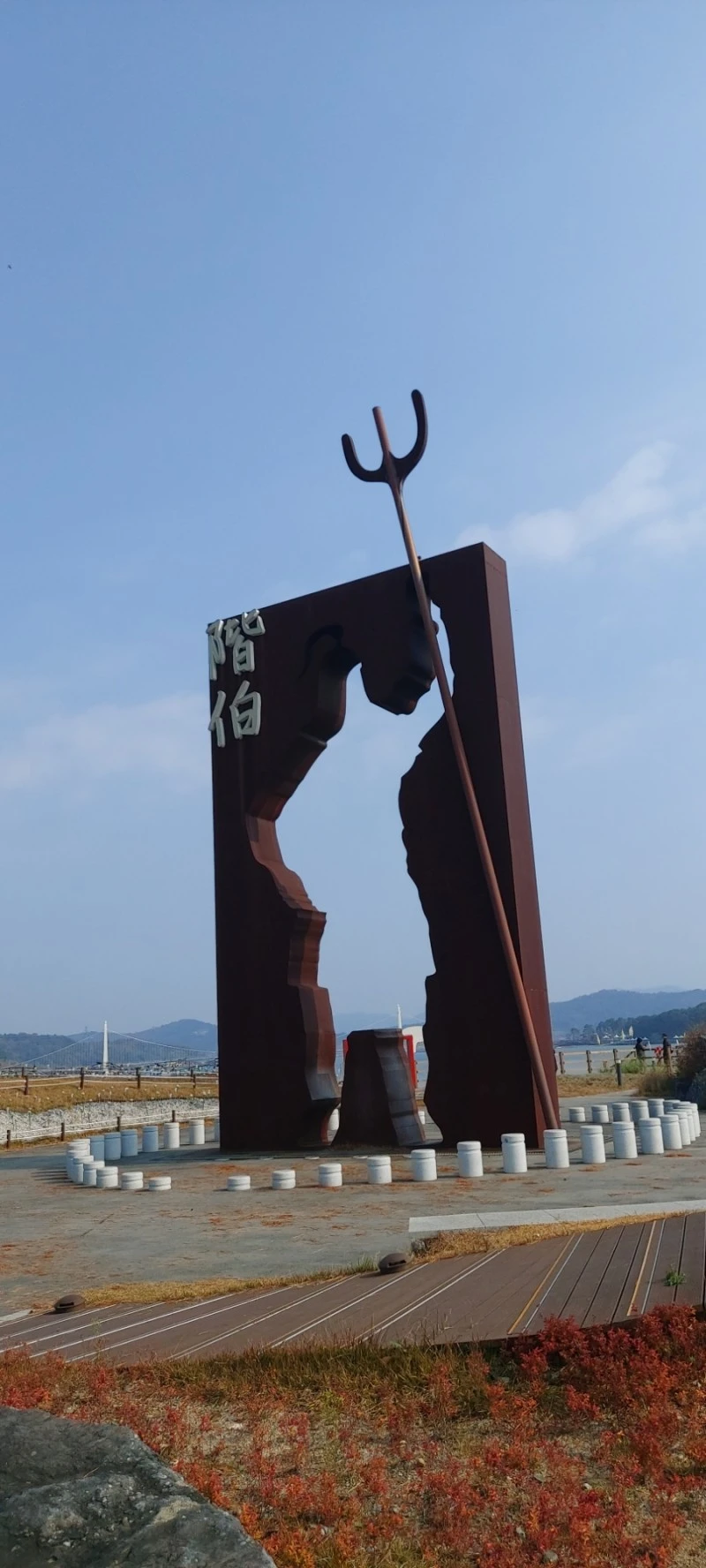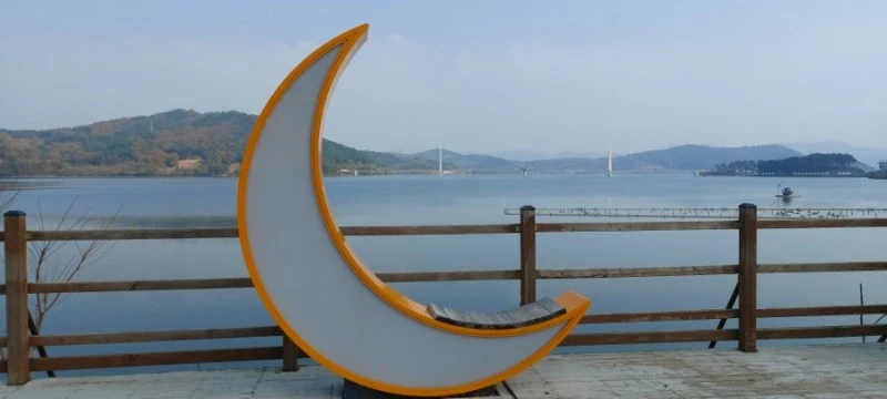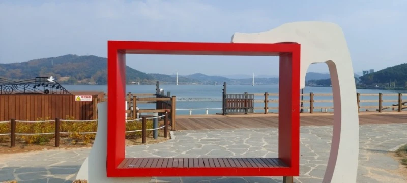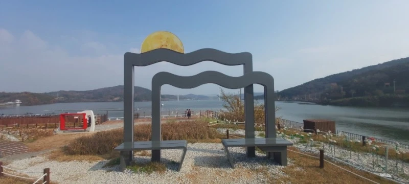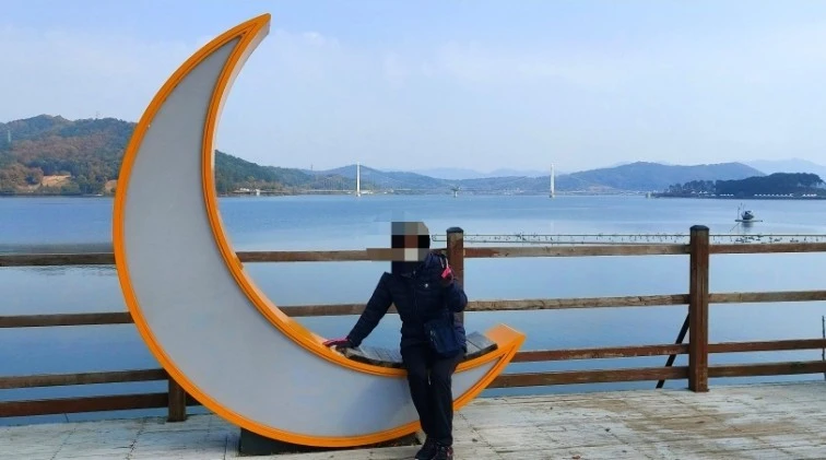 음악분수를 새로 만든 탑정호 충혼공원은 전과 달라진 풍경들이 많았는데, 공연장 지나서 한켠에 마련된 그믐달 모양의 조형물에 앉으면 멀리 뒤편으로 출렁다리가 한눈에 들어와 인증샷하기 딱 좋았다.