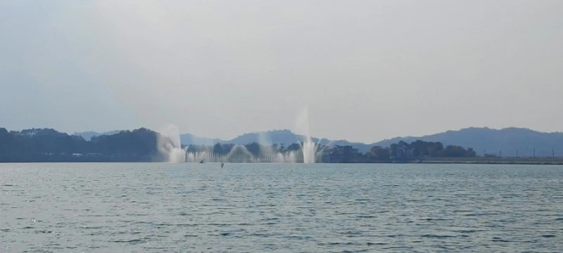 탑정호는 낚시꾼들에게 인기많은 낚시터인데 출렁다리와 음악분수 주변의 제방과 수변은 낚시금지구역이라 사이버 낚시를 할 수 있는 포인트가 마련되어있다. 안내판에는 바코드 찍어서 앱으로 AR낚시를 즐기는 법과 이 포인트의 주요 어종이 나와있다. 재밌는 건 절대 휴대폰을 던지지 말라는 경고문구가 빨간 글씨로 쓰여있다는 점이다. 낚시앱 따라서 하다가 많이들 던진 모양이다.^^