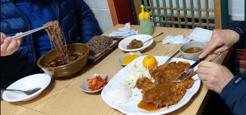 한 시간 반가량 탑정호 출렁다리와 둘레길을 걸어서 주차장 도착하니 딱 정오가 되어서 가까운 논산시내 반월소바에서 메밀소바와 돈까스로 점심을 먹었다. 맛집으로 소문난 곳이라 30분 정도 기다렸지만 어머님께서도 맛있게 드셔주셔서 기다린 보람이 있었다.