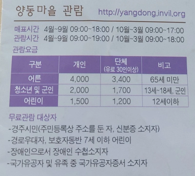 양동마을 관람은 주차장에 차를 대고, 입구에 있는 유물전시관을 둘러본 뒤(여기는 무료), 전시관 뒤에 마련된 매표소에서 입장료(어른 4천원, 청소년 및 군인 2천원, 어린이 1500원)를 지불하면 들어가볼 수 있다. 매표와 관람시간은 4월~9월에는 9시~18시(관람시간 9시~19시) / 10월~3월은 9시~17시(관람시간 9시~18시)이다.