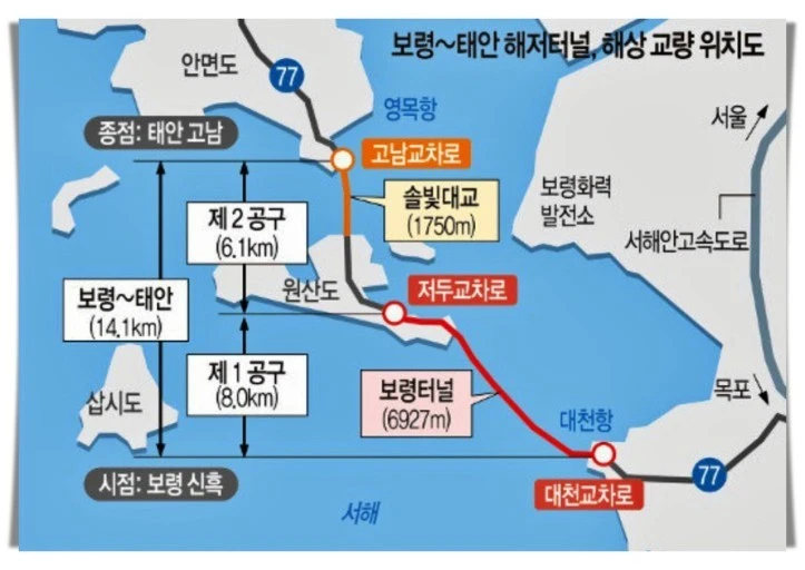 국도 77호선은 파주에서 부산까지 이어지는 도로인데, 충남 보령시 신흑동에서 태안군 고남면 고남리까지 총 14.4km를 잇는 국도 77호선 태안-보령 연결도로의 중간에 위치한 보령해저터널이 개통하면서 완벽하게 이어지게 됐다. 이는 국가의 새로운 동맥이 연결된다는 의미가 있고, 교통 여건이 획기적으로 개선되면서, 서해안 지역의 관광 산업에도 탄력이 붙을 거란 전망이 나오는 배경이다. 이번 보령해저터널 개통 덕분에 관광지 개발사업지구로 지정되고도 수십 년 동안 사업자를 구하지 못했던 태안 안면도와 서산 간월도 개발 사업이 최근 민간 투자 유치에 성공했다는 소식도 들려온다.