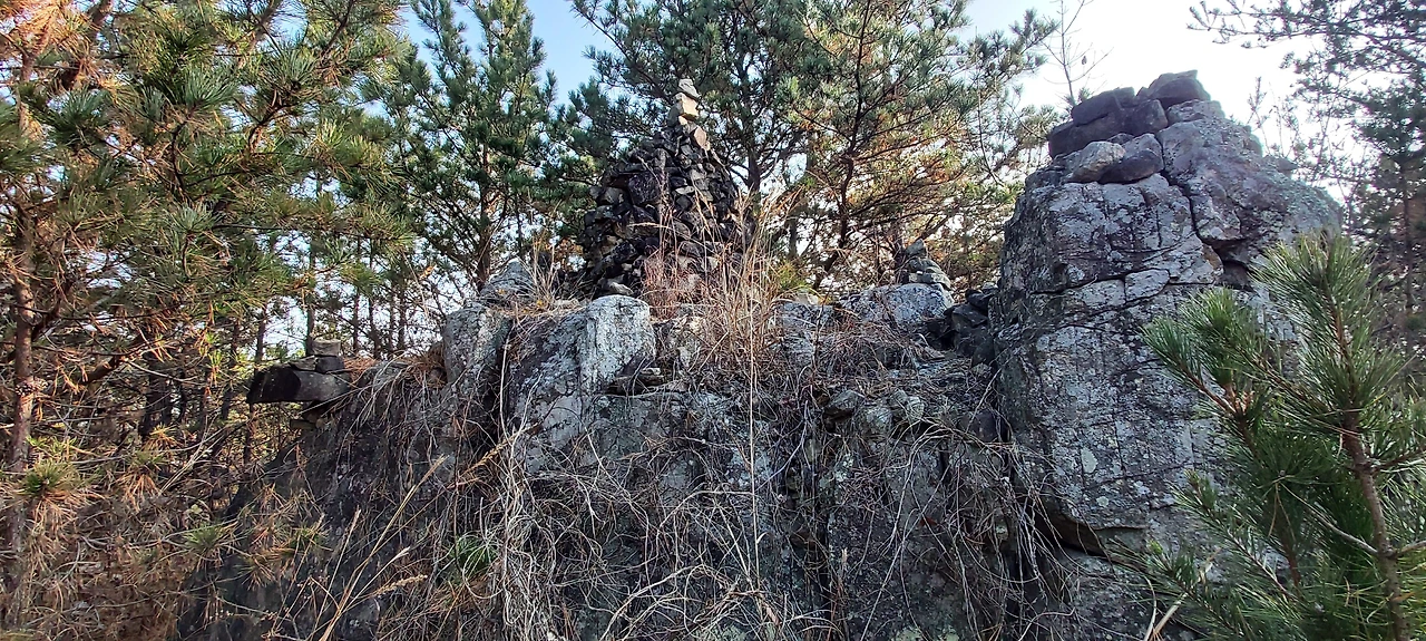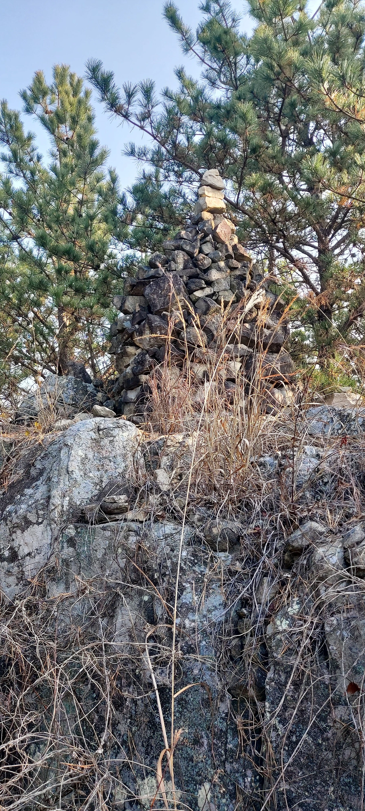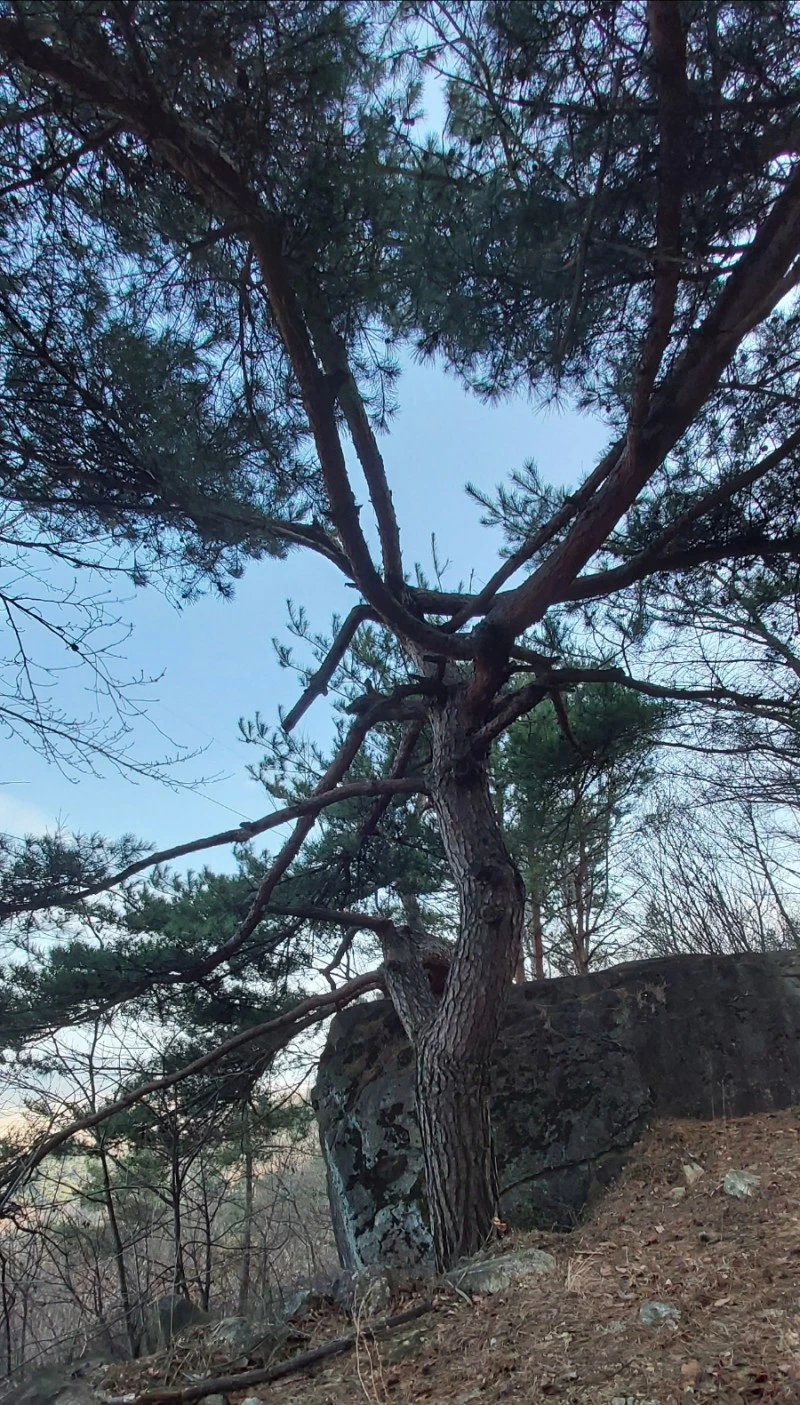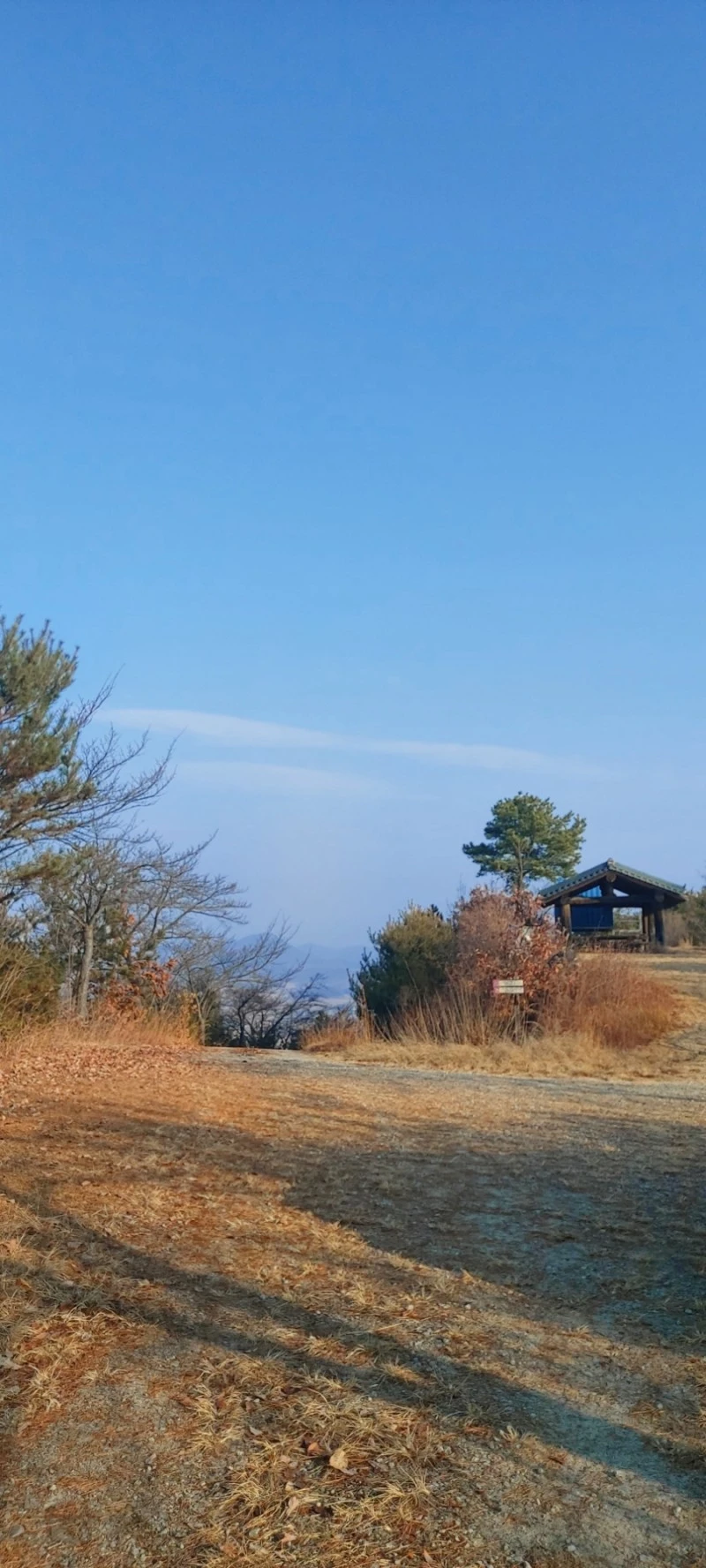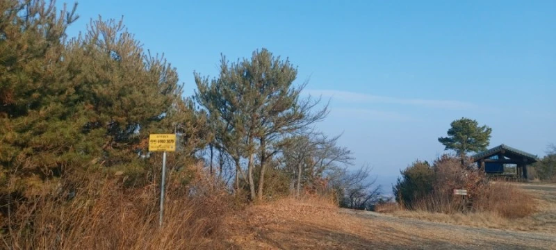 임도를 오르다보면 중간에 오른쪽으로 덤바우가 보인다는데 차로 슈웅 가서 그런지 발견하지 못했다. 그보단 벚나무가 쭉 이어지던 임도에서 갑자기 왼쪽에 나타난 멋드러진 소나무가 상당히 인상적이었다. 차로 5분여를 오르면 왼쪽에 정자가 마련된 정상에 다다른다.