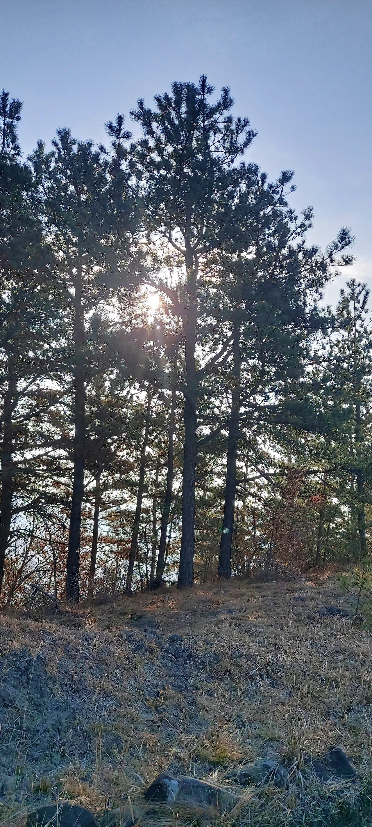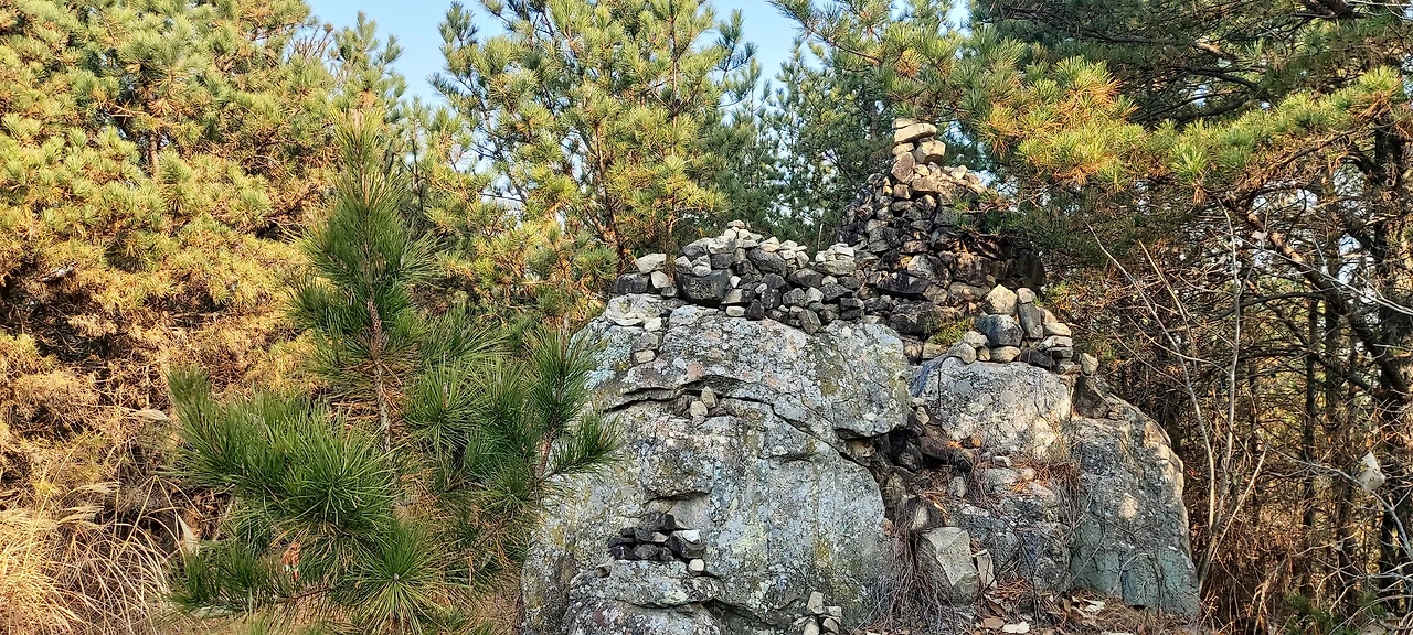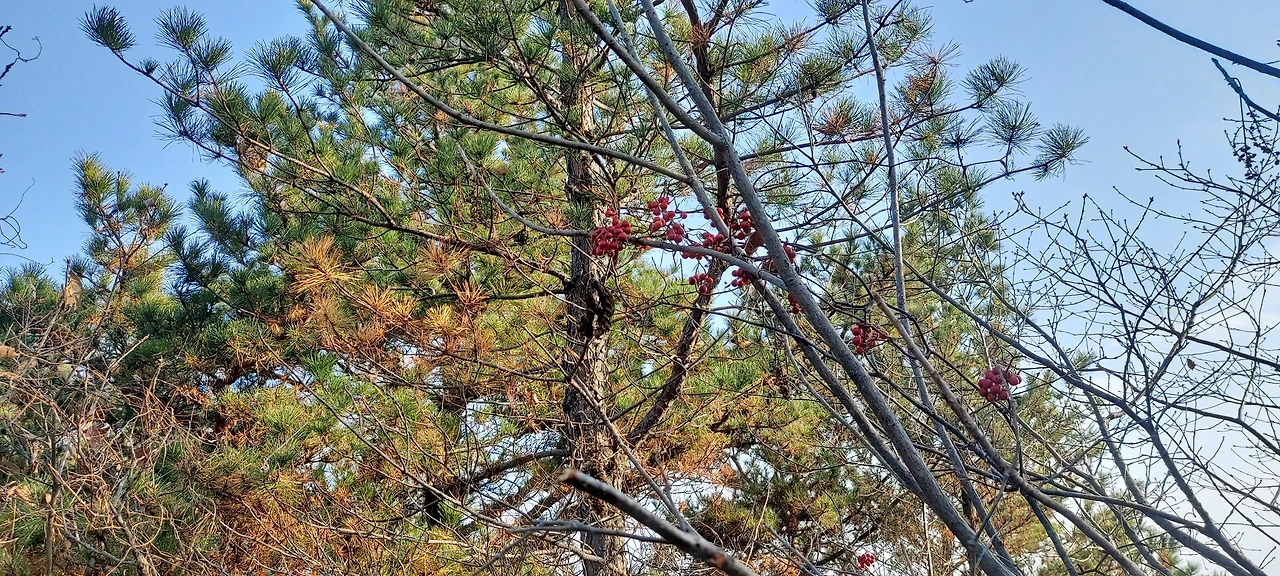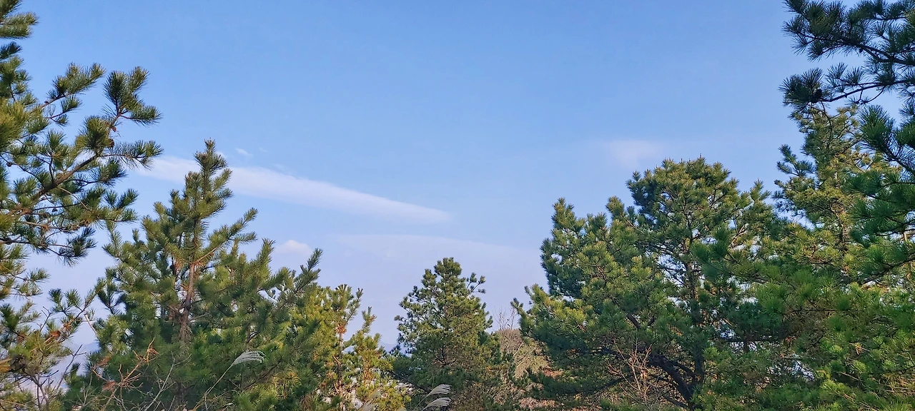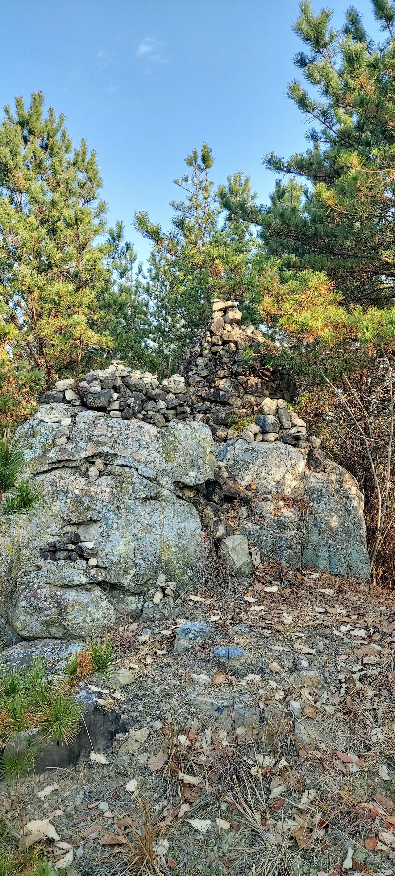 임도를 오르다보면 중간에 오른쪽으로 덤바우가 보인다는데 차로 슈웅 가서 그런지 발견하지 못했다. 그보단 벚나무가 쭉 이어지던 임도에서 갑자기 왼쪽에 나타난 멋드러진 소나무가 상당히 인상적이었다. 차로 5분여를 오르면 왼쪽에 정자가 마련된 정상에 다다른다.