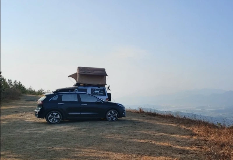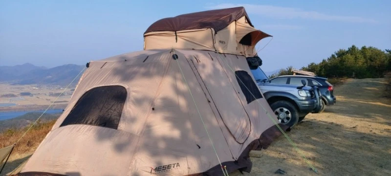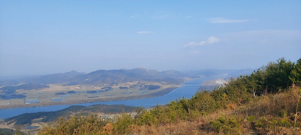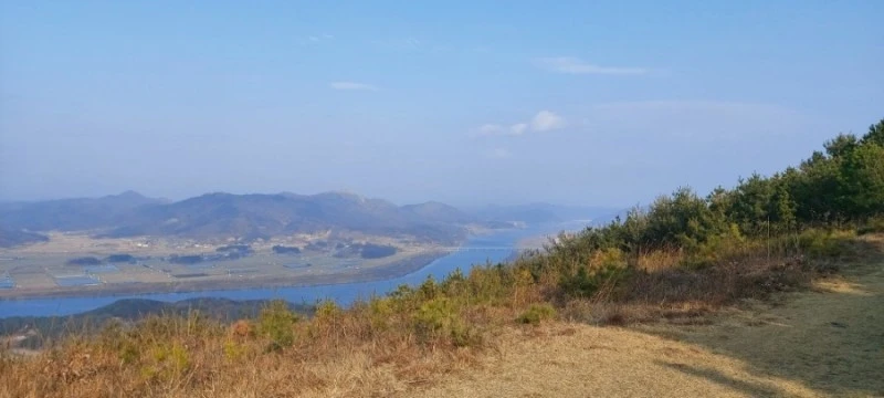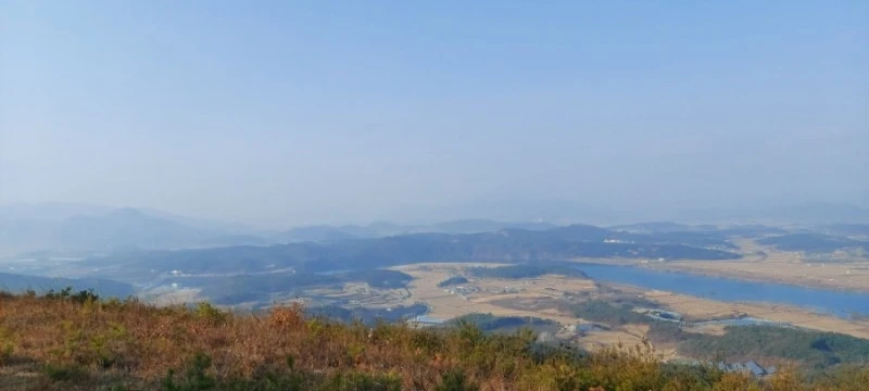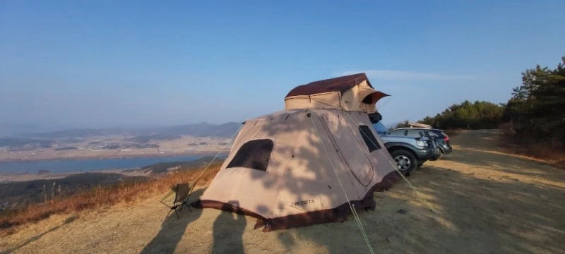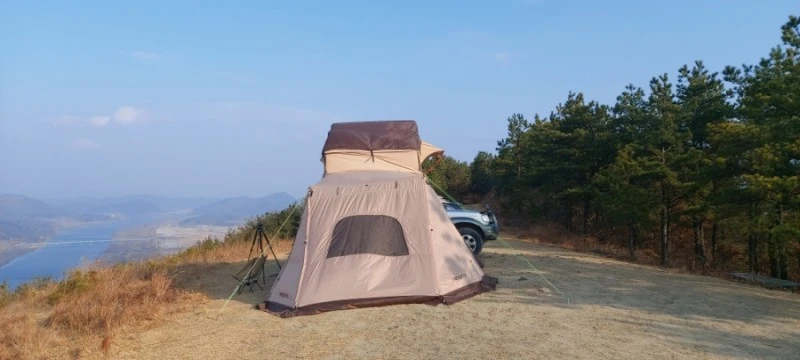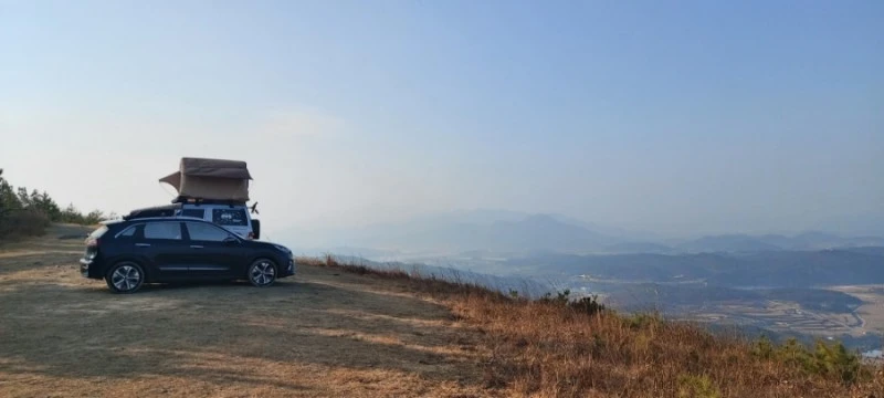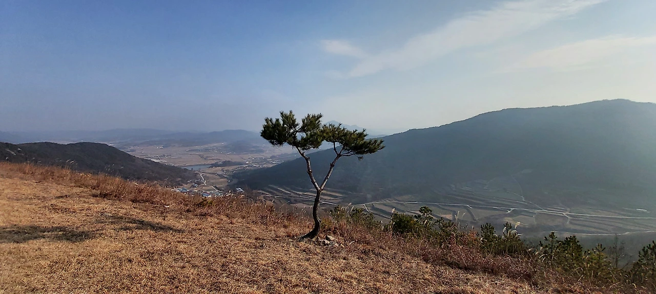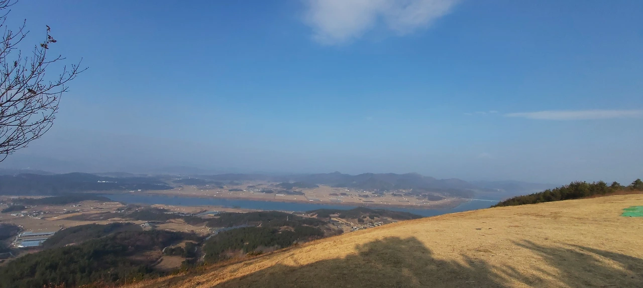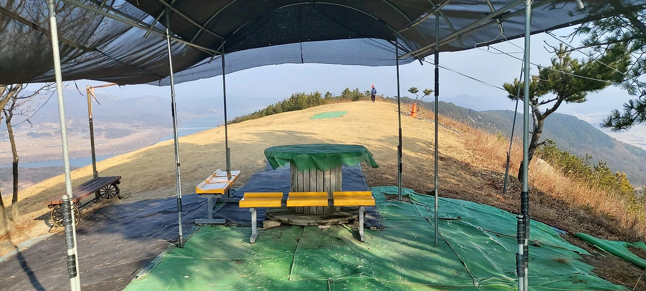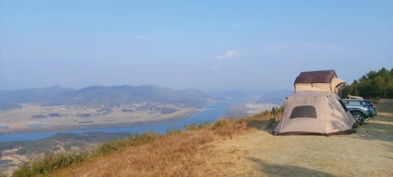 정자 앞의 너른 공간에 차를 세우고, 정자 반대편으로 난 오솔길을 따라 걸었다. 5분쯤 걸으면 나무들이 사라지고 전망이 트인 공간이 첫번째로 나오는데, 이곳은 활공장이 아니다. 최근 차박전문 유튜버 밍동이 소개했다는 낙동강 조망의 차박지인데, 아침 9시 조금 넘어 도착한 그곳에는 차 두 대가 차박중이었다. 각각 따로 오셨다는데, 한 분은 텐트까지 준비해서 차박을 하셨고, 다른 한 분은 차 속에서 차박을 하셨다. 텐트에서 잔 분은 밤의 별사진과 일출 사진을 찍으려고 부지런히 움직이셨다는데, 차에서 잔 분이 9시가 넘도록 안 일어나니 혹시나 질식한 건 아닌가 걱정되서 좀있다 깨워보려 한다고 하셨다. 이곳에 있으면 겨울에도 은하수를 볼 수 있다고 한다.