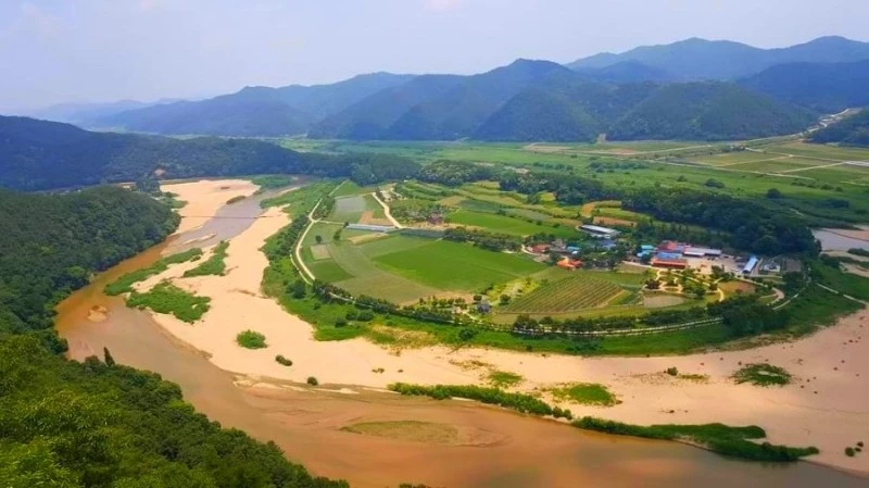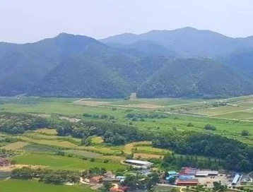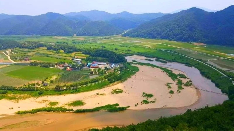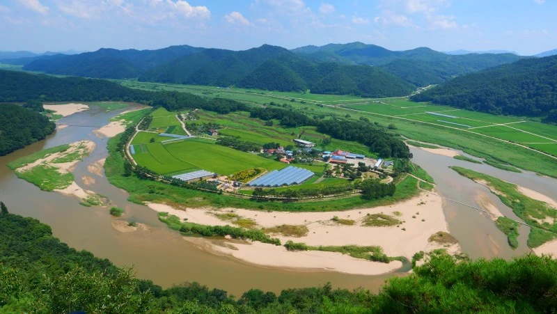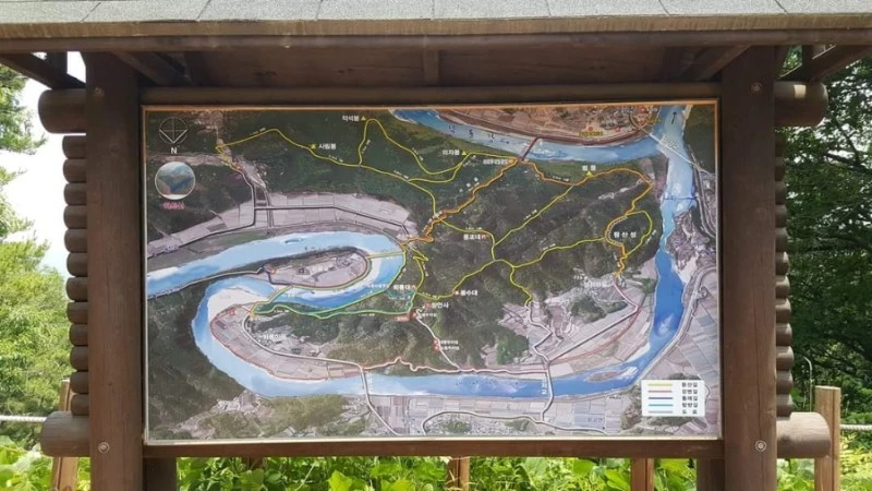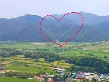 회룡대에서는 회룡포의 전경뿐만 아니라, 그 뒤로 멀리 떨어져있는 산에 하트 모양이 선명하게 만들어진 것도 볼 수 있다.