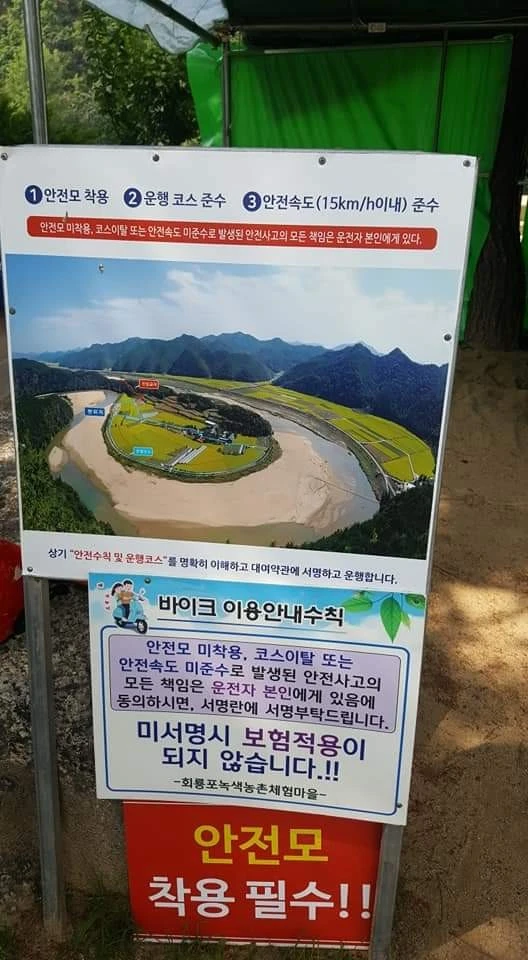 올레길은 회룡포마을의 주변부를 빙 돌게 되어있지만, 마을안길로 들어가면 관광객들을 위한 다양한 체험과 행사가 준비되어 있다. 우리가 방문했던 날도 어린 아이들과 함께 온 가족들이 분주히 뭔가를 하는 모습도 멀리 보이고, 마이크에선 사회자의 목소리와 함께 흥겨운 음악이 울려퍼지고 있었다.(코로나전이라 그땐 그랬지만 지금은 어떨른지... 미로공원도 있고 큰 행사장도 있고 그렇다) 그리고 올레길을 걸어도 되지만, 옆의 도로로 바이크를 타고 달릴 수도 있다. 마을입구에 바이크 대여소가 있어서 그곳을 이용하면 된다. 꽤 많은 이들이 바이크를 타고 올레길 옆을 신나게 달렸다.