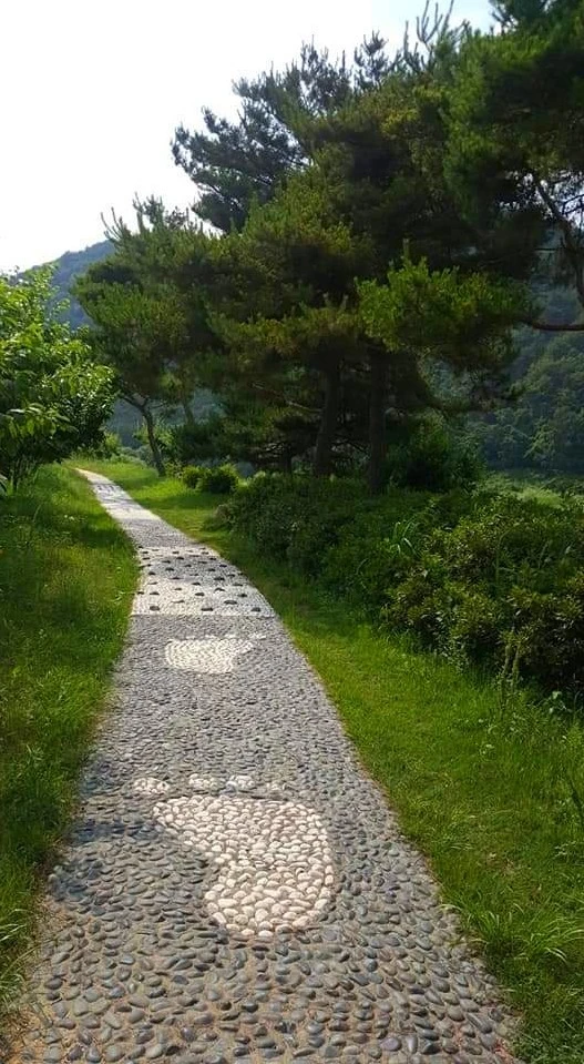제1 뿅뿅다리뿐만 아니라 제2 뿅뿅다리도 있는데, 이 다리는 마을 건너편에 있어서 마을안길로 가거나 올레길을 따라 가야 한다. 우리는 올레길을 따라 제2 뿅뿅다리로 갔다. 1박 2일도 왔다간 그곳에는 길이 잘 정비가 되어 있었다. 우리가 찾았던 6월 중순은 날이 좀 더운 편이었는데, 나무그늘과 맨발산책로가 어우러진 올레길은 시원하고 좋았다.