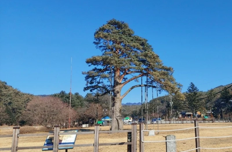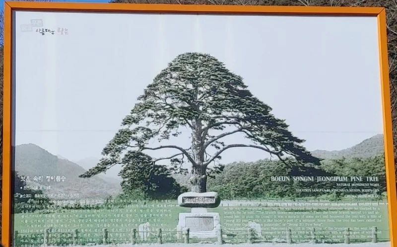 말티재만 다녀오긴 아쉬워서 근처에 있는 속리산 법주사 앞의 정이품송도 보러 갔다. 오래 전 서쪽 가지가 눈더미에 꺾인 뒤로 점점 풍채가 줄어드는 듯한 정이품송이 추위 속에서도 꿋꿋하게 서서 우리를 맞이했다. 표지판의 사진처럼 온전한 가지가 양쪽으로 쭉 뻗고 있었다면 훨씬 더 멋진 모습이었을 텐데...