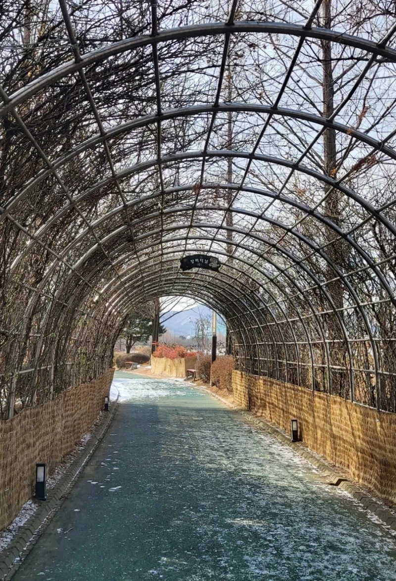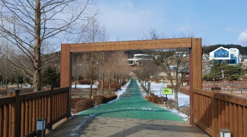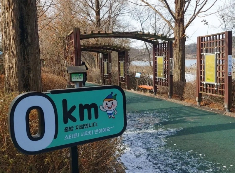 곳곳에 벤치와 하트 포토존, 느티나무 쉼터, 장미터널, 능소화 터널, 춘향이 그네, 정자와 연못, 아기자기한 조형물들로 꾸며져 있다. 총 둘레 4.8km에 맞춰 주차장 입구에 0부터 시작해서 1km, 2km, 3km, 4km 지점마다 표지판이 있어 내가 얼마쯤 걸었나 가늠도 되고, 앱을 이용하면 내가 걸은 만큼 기부도 할 수 있다.