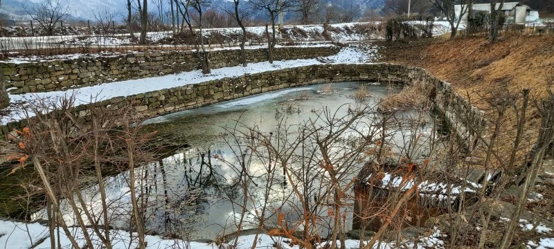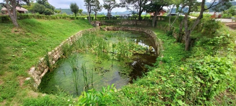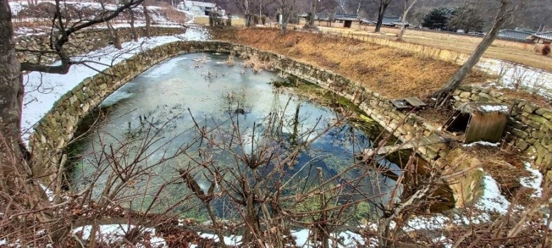 김명관 고택은 창하산을 등지고 앞으로는 동진강 상류의 맑은 물이 흐르는 곳에 동남쪽을 향하여 자리 잡고 있는데요, 한양에서 내려온 김명관이 청하산 아래 명당을 골라 10여 년에 걸쳐 이 집을 완공했다고 해요. 대문 앞쪽으로 30여 평의 연못을 만들었는데, 이 연못이 또 볼 만하지요. 현재 주차장 화장실 바로 옆에 있어요.