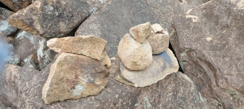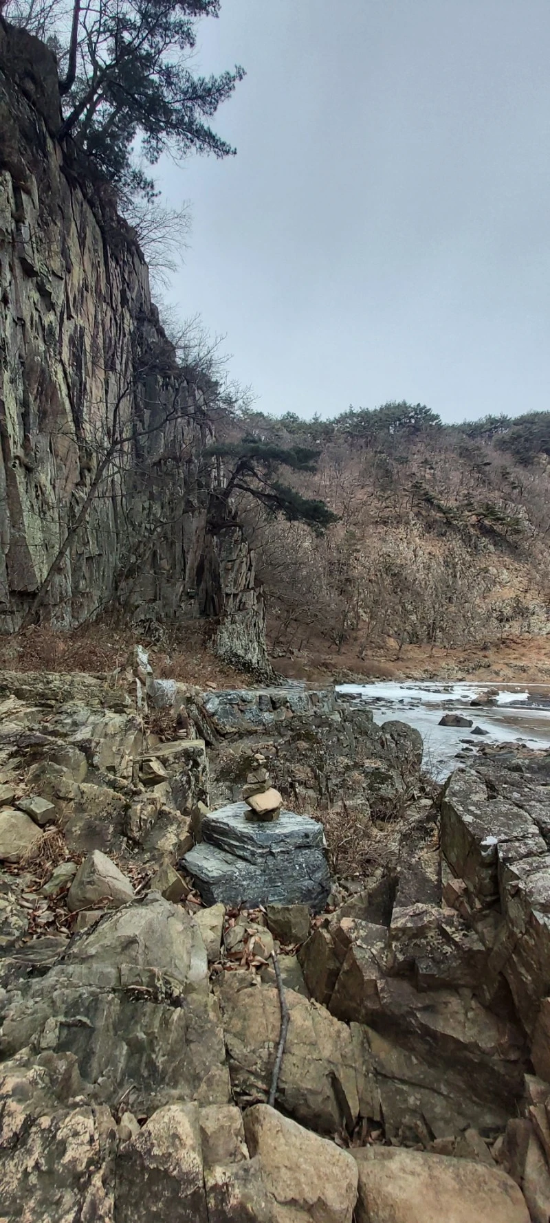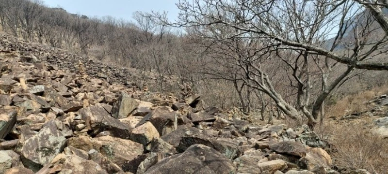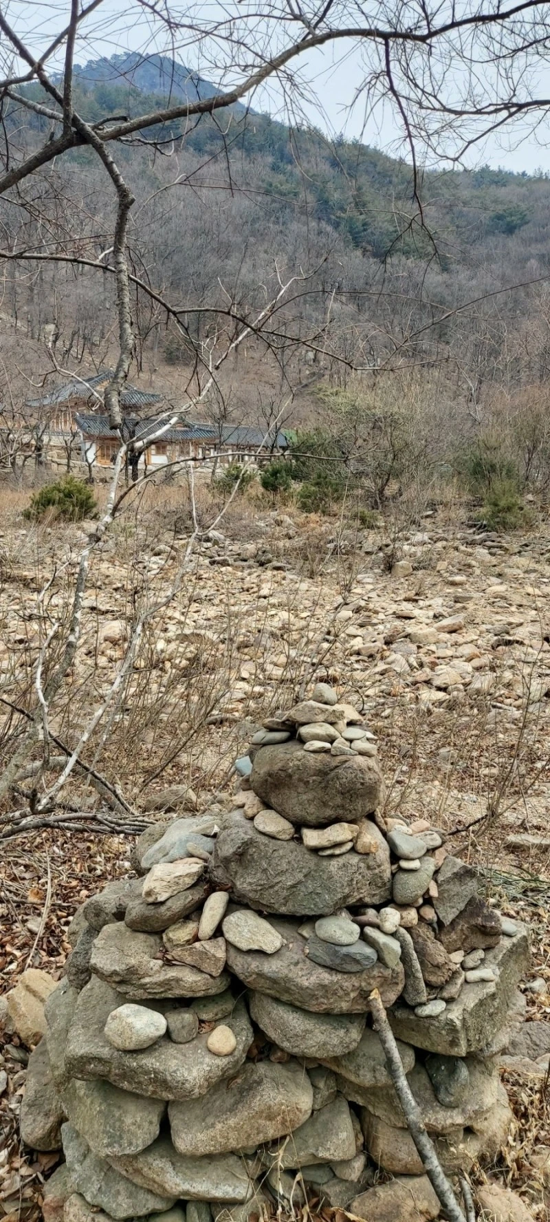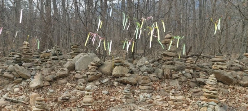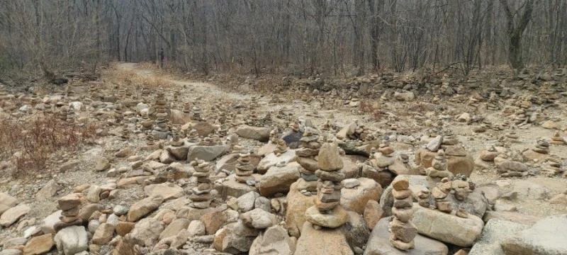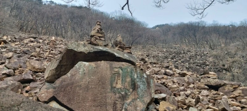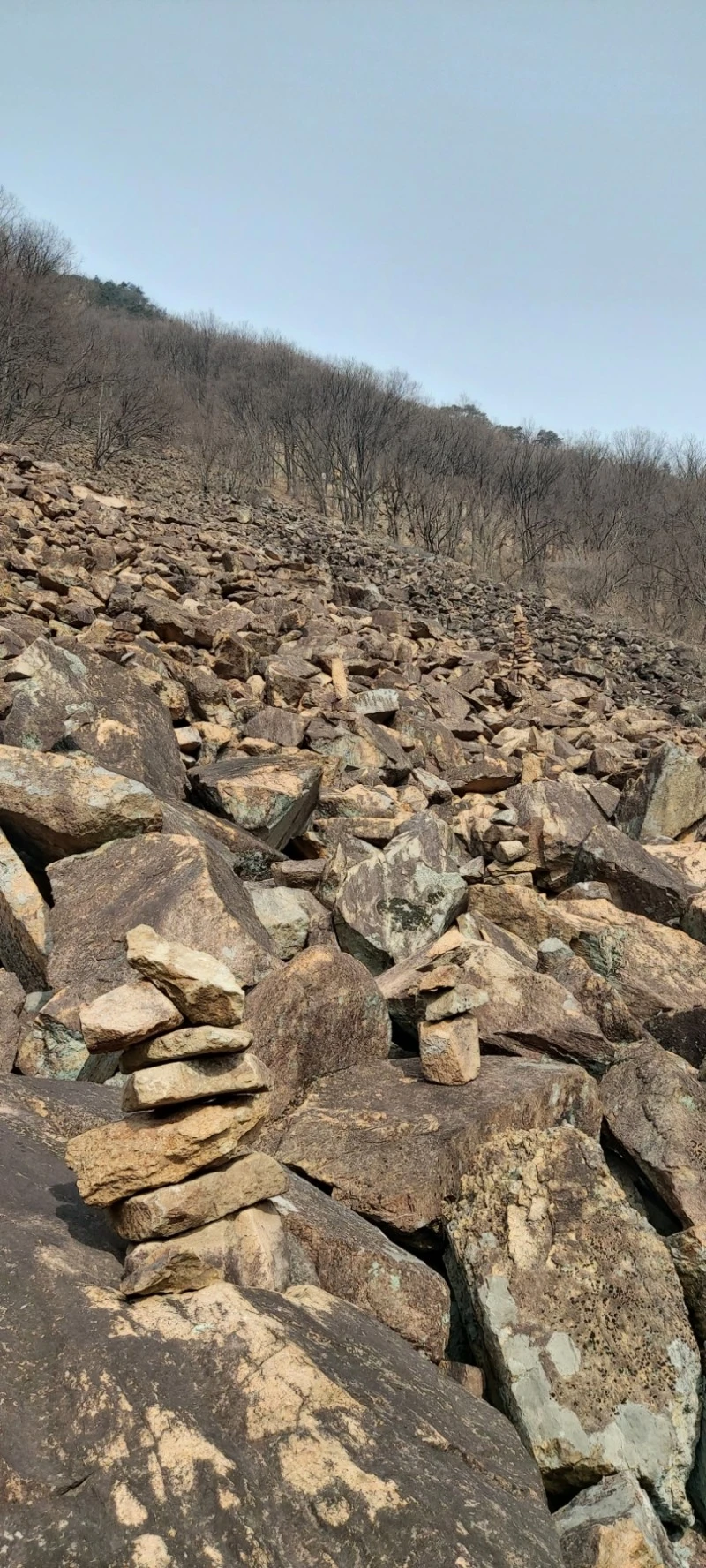 돌이 마치 강물처럼 흘러내린 모습이 밀양 만어사의 경석들을 떠올리게 해서 혹시 이 돌도 두드리면 소리가 나나? 하고 작은 돌멩이를 들고 쳐봤는데, 탁탁 소리만 날뿐 만어사처럼 둥 딩 뎅~ 하는 소리는 안 들리더라구요. 대신 평평하고 자잘한 돌들이 많아서 돌탑을 쌓기엔 안성마춤이라 가족의 건강과 코로나가 어서 물러가기를 바라며 돌탑을 몇 개 쌓았답니다.