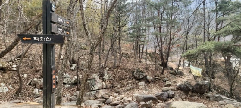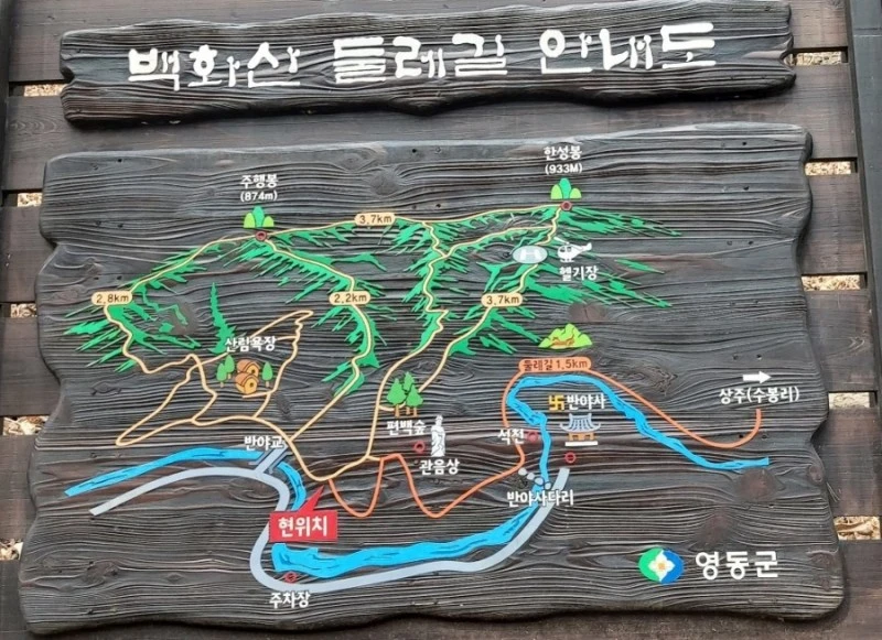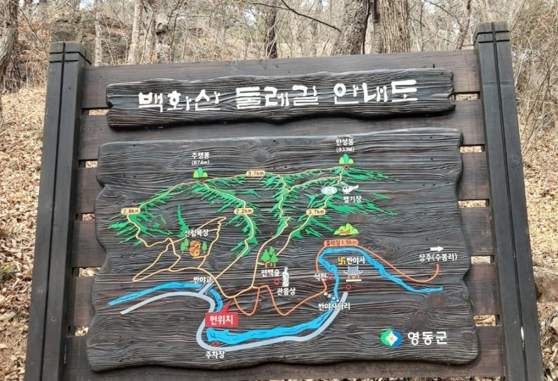 해발 933m의 백화산은 충북 영동과 경북 상주의 경계에 위치하고 있는 산으로 바위가 많고 한폭의 그림과도 같은 빼어난 자연경관을 자랑하고 있는 산이랍니다. 백화산은 충북 영동군 황간면에서 자동차로 20분 정도 북쪽으로 가면 나오는 반야사 입구에서 오르기도 하지만, 낙타등과 같은 능선을 하고 있는 경북 상주시에서 오르는 사람도 있다네요. 실제 '백화산 둘레길'로 검색하면 상주가 먼저 뜨더라구요. 반야사쪽 산중턱에는 "저승골" 이라 불리는 협곡이 숨어 있어 모험가들의 호기심을 불러일으키는 곳이라고 해요. 우리는 등산을 할 게 아니라서 백화산 둘레길만 조금 걸었어요.