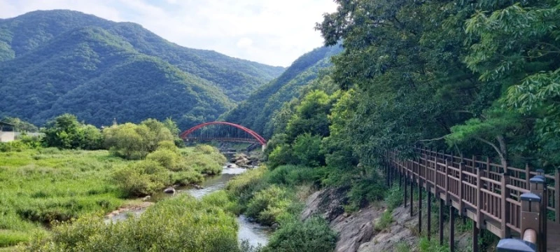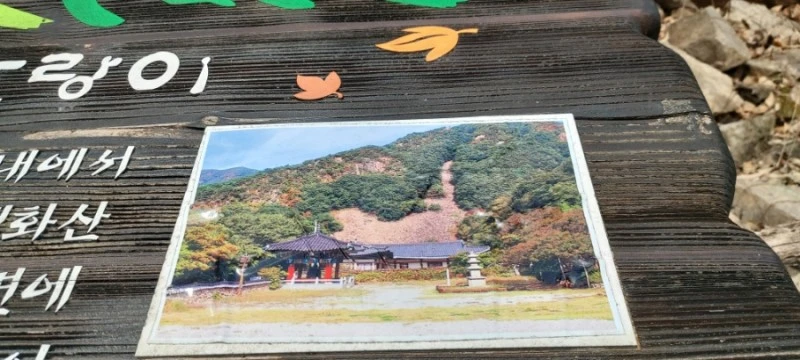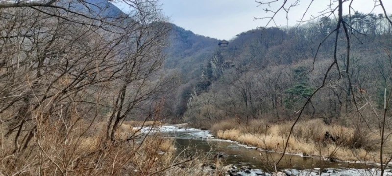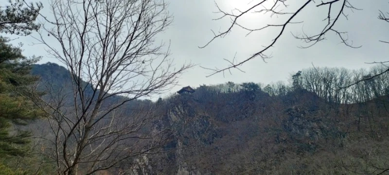 세조가 피부병을 치료했다는 이야기가 전해내려오는 석천 위 높다란 절벽 위에 문수전이 올라앉은 모습이 보이는 맞은편까지 갔어요. 2년 전 여름 문수전에서 내려다보았던 백화산 풍경을 이번엔 반대편 둘레길에서 올려다보고는 슬슬 되돌아나왔답니다.