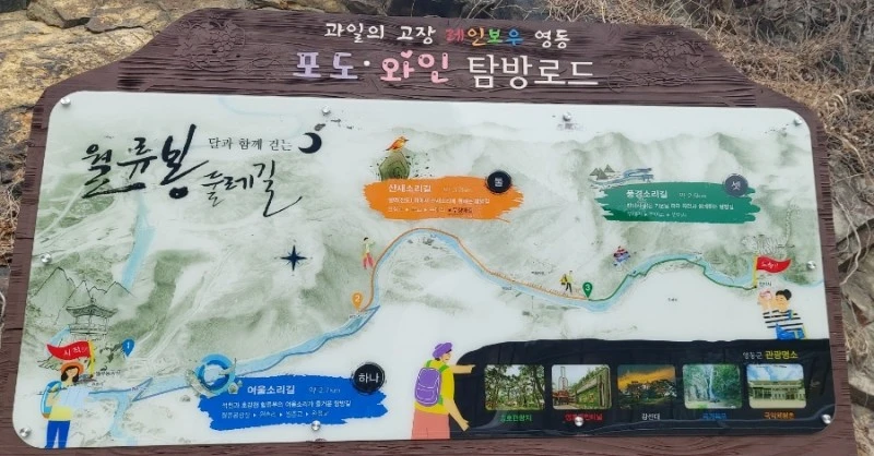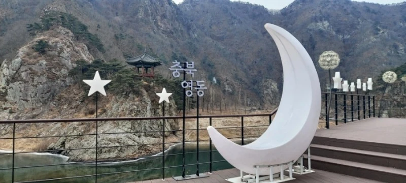 먼저 월류봉 둘레길의 시작인 월류봉부터 알현하기로 했어요. 바람이 제법 부는 추운 날씨였음에도 이곳을 찾는 관광객들이 의외로 많으시더라구요. 그중에서도 월류봉 광장에서 마주친 중년여자분들의 즐거운 웃음소리가 기억에 남아요. 남편에게 사진을 좀 찍어달라고 부탁하셔서 그분들 단체사진도 찍어드리고, 하하호호 웃으시는 모습을 옆에서 바라보았는데요, 공기 맑은 곳에서 친구들과 함께 여행을 즐기시는 모습이 보기 좋았답니다.