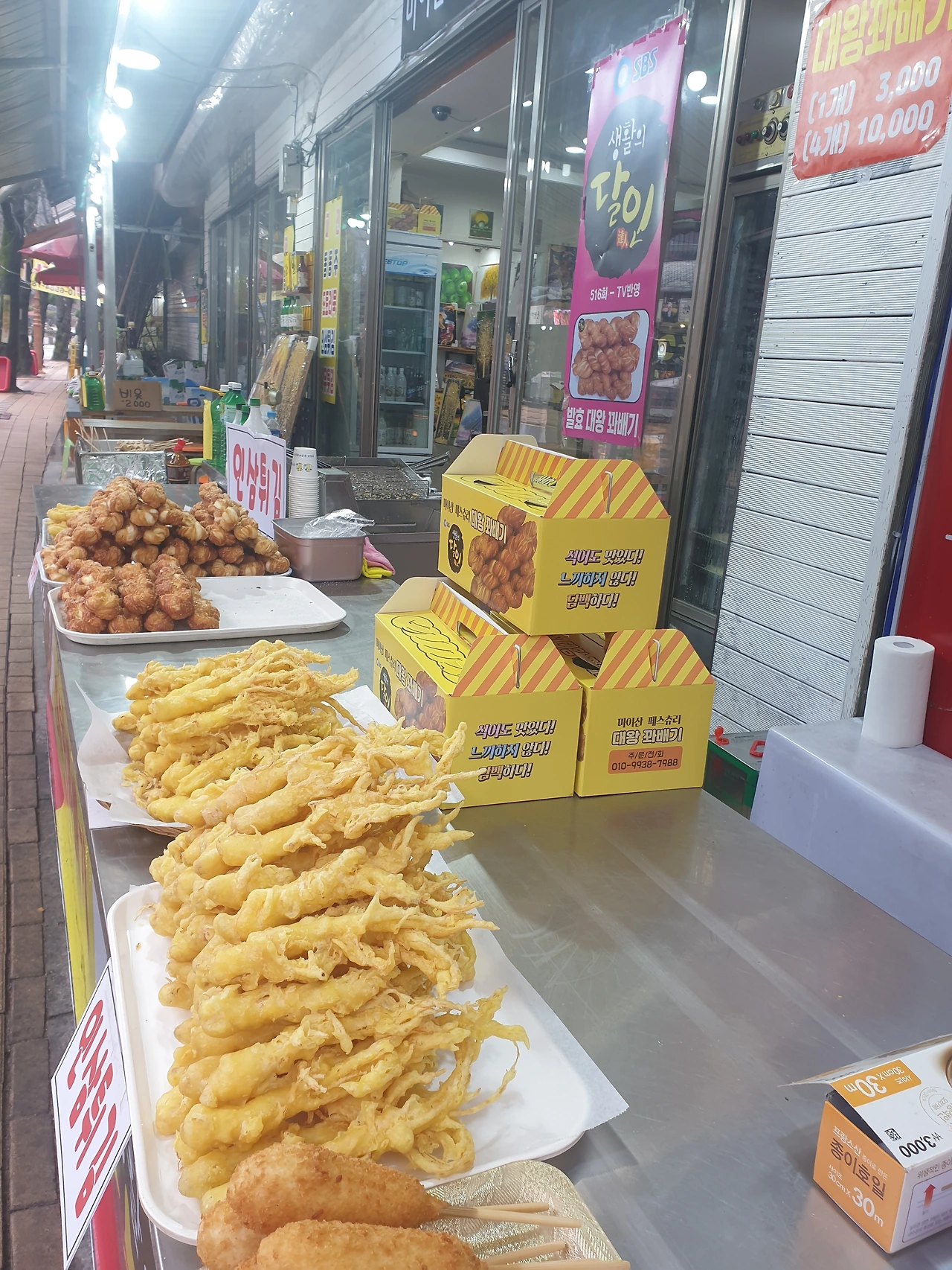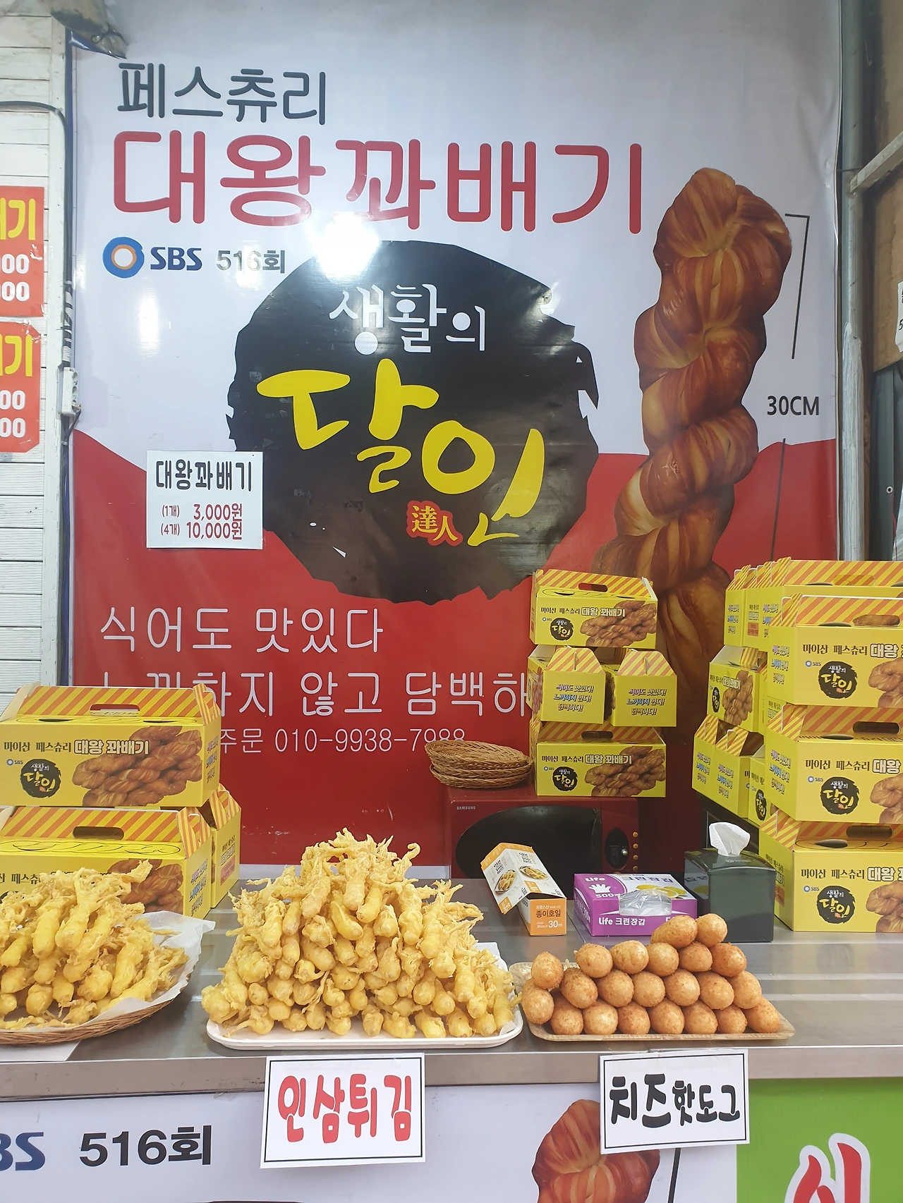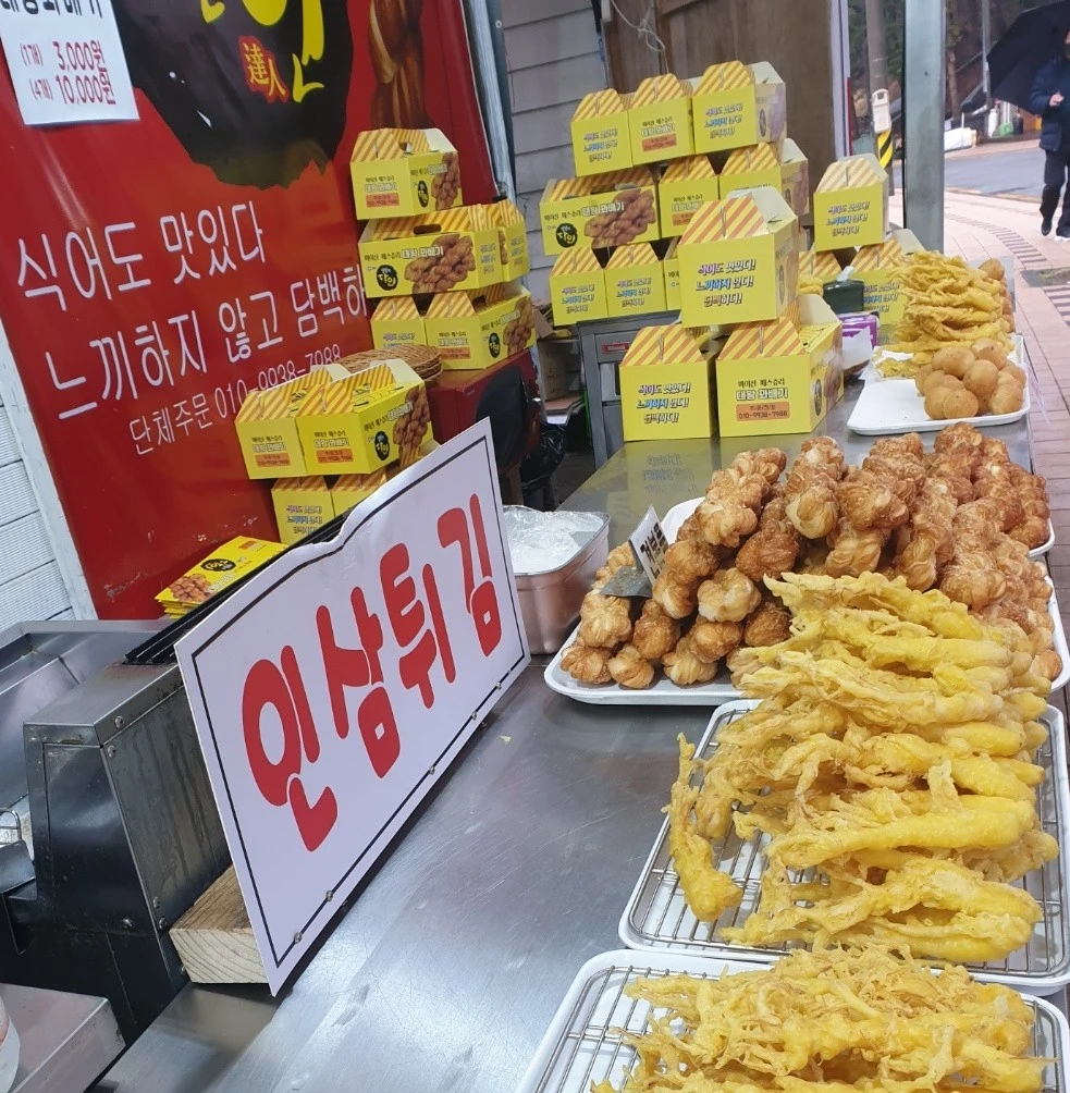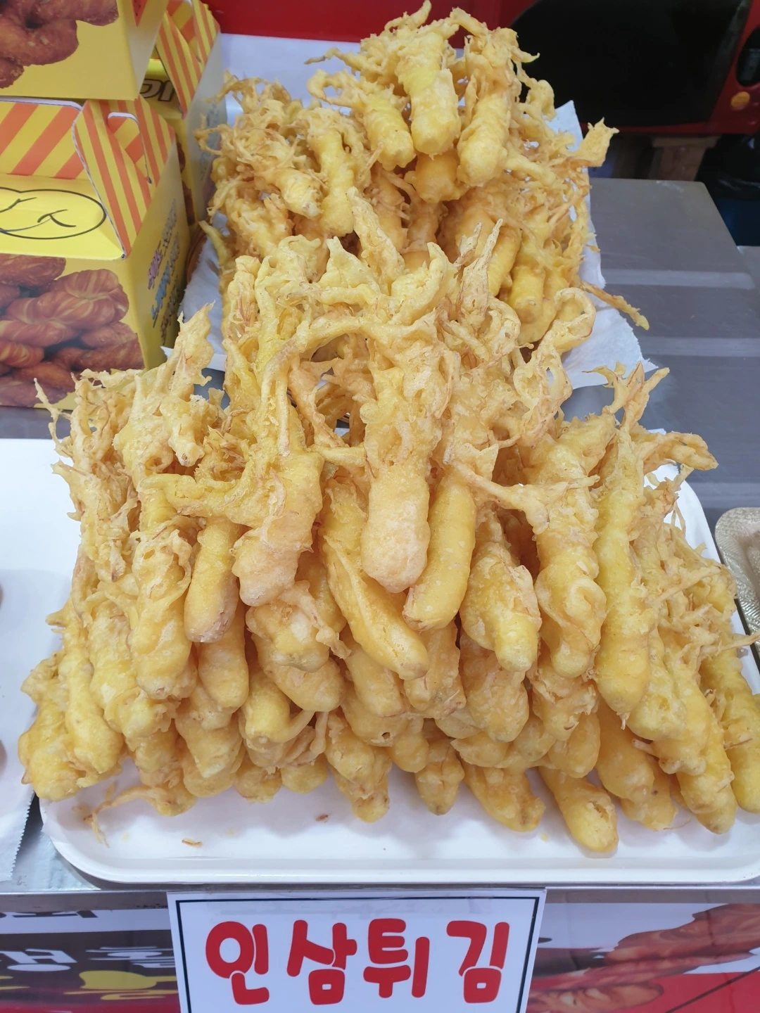 그간 꽈배기만 사먹느라 몰랐는데, 인삼튀김도 파시더라구요. 어머님께서 작년에 금산 인삼시장의 인삼튀김을 맛있게 드셨던 게 생각나서, 가격을 여쭤보니 인삼튀김은 한개 2천원, 한 접시 만원이라고 하셔서 어머님 드리려고 한 접시 포장하고, 옆에 찰깨빵이 보여서 그건 5개 3천원, 9개 5천원이라고 하셔서 아이들 먹게 그것도 5천원어치 사서 같이 박스에 담아왔어요. 2만 5천원으로 풍족한 나들이 선물이 되었어요.