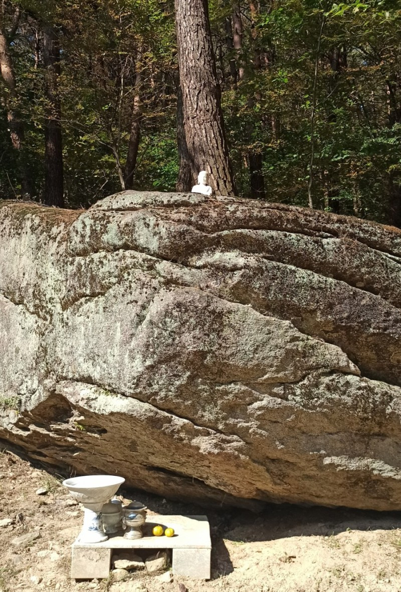 입구 오른쪽에 제법 널찍하고 커다란 바위가 있는데 그 위에 작은 석불이 앉아서 "어서 옵쇼~" 하고 먼저 반겨준다. 우리의 주인공 마애석불입상은 등을 돌리고 먼 산을 보고 계신 중이다. 바위 아래에는 얼마 전 누군가 공양을 드렸는지 양초와 음식이 보였고, 바위 옆으로는 빗자루를 비롯한 청소도구가 있어서 이곳이 잘 관리되고 있다는 인상을 받았다.