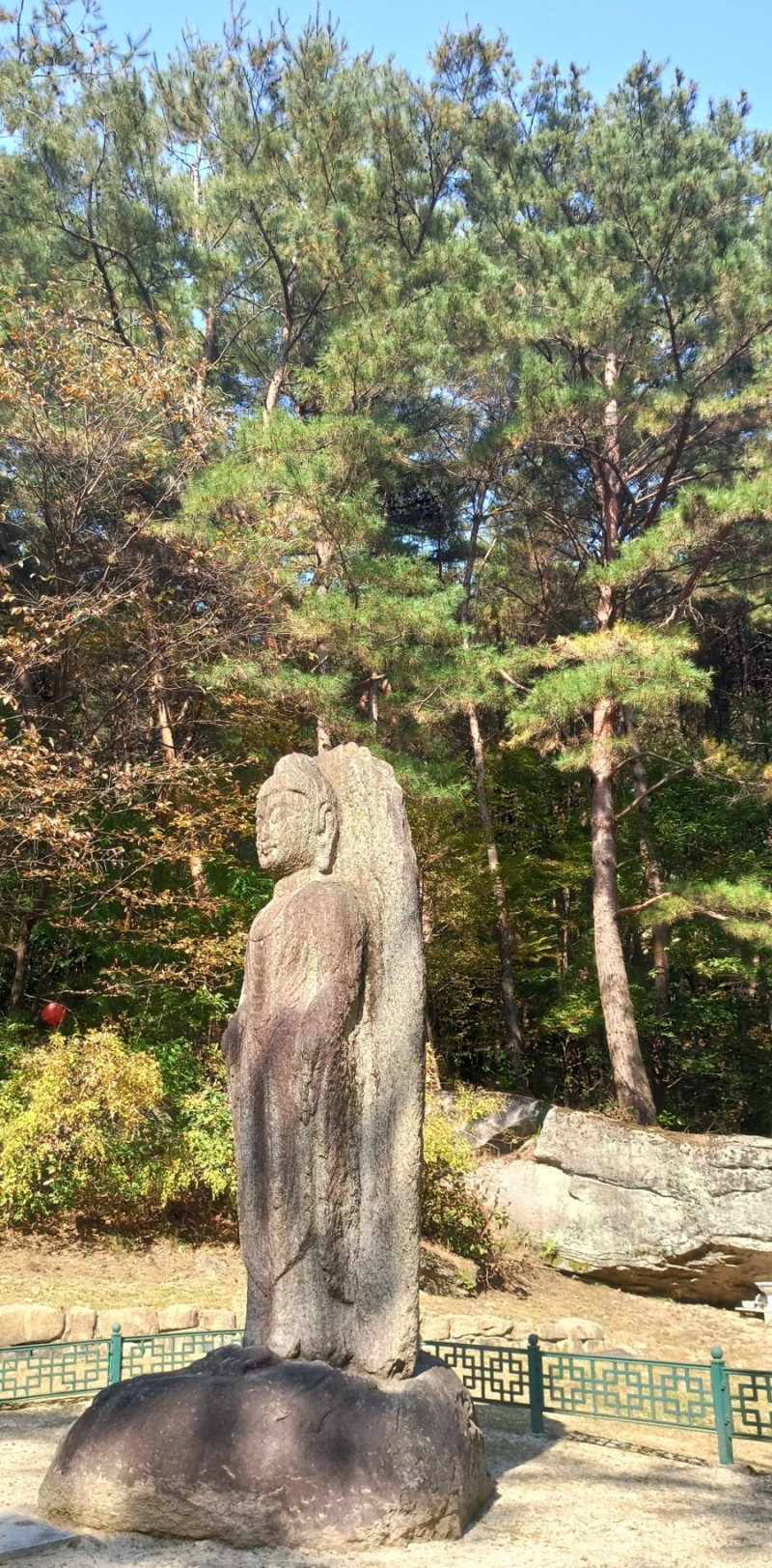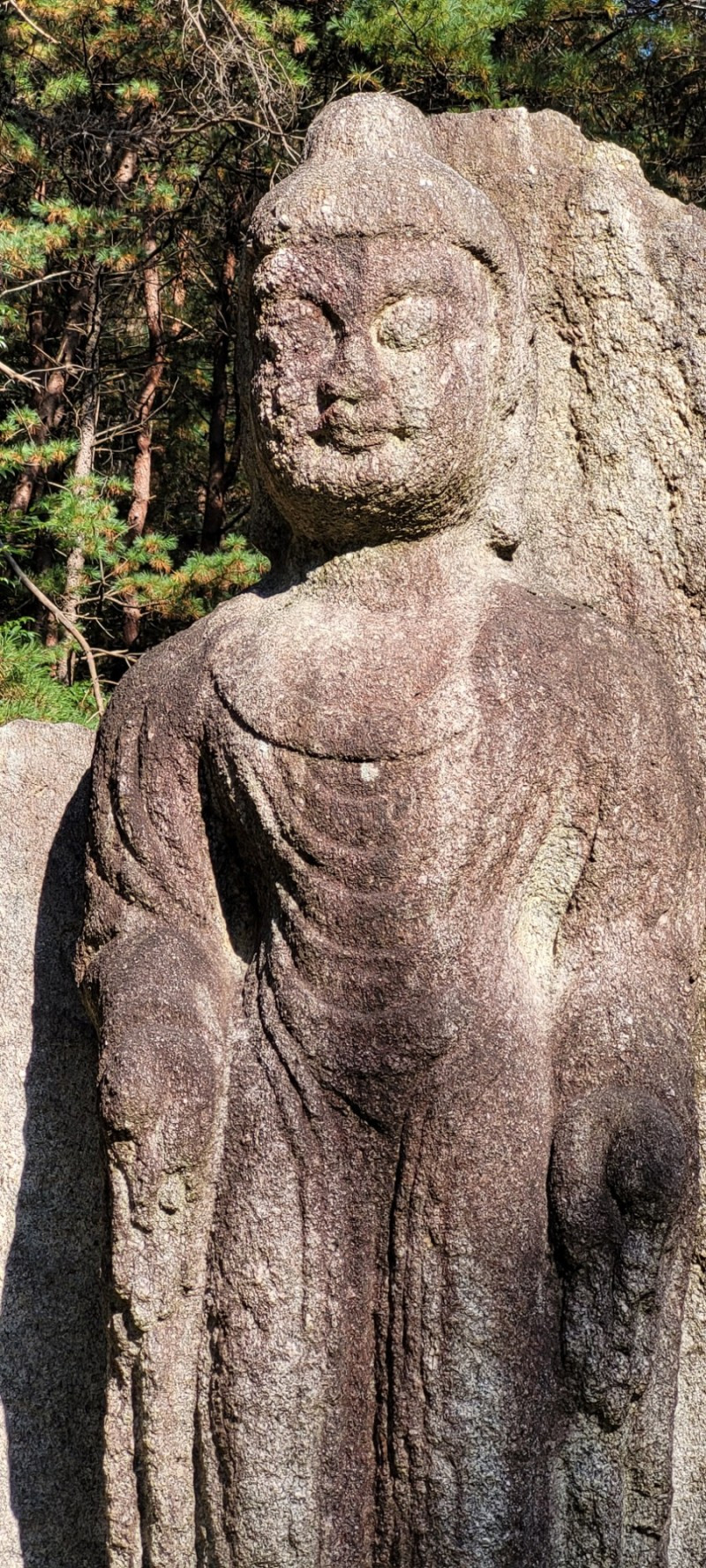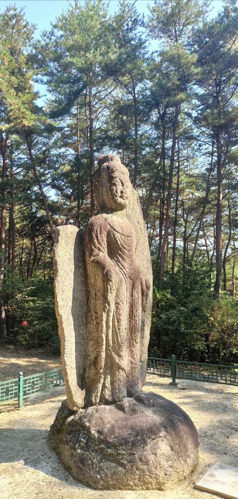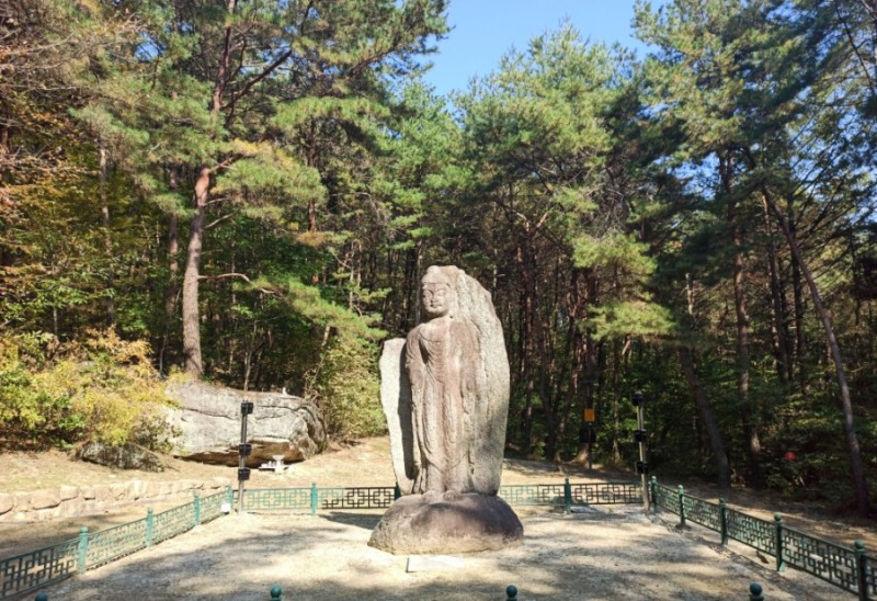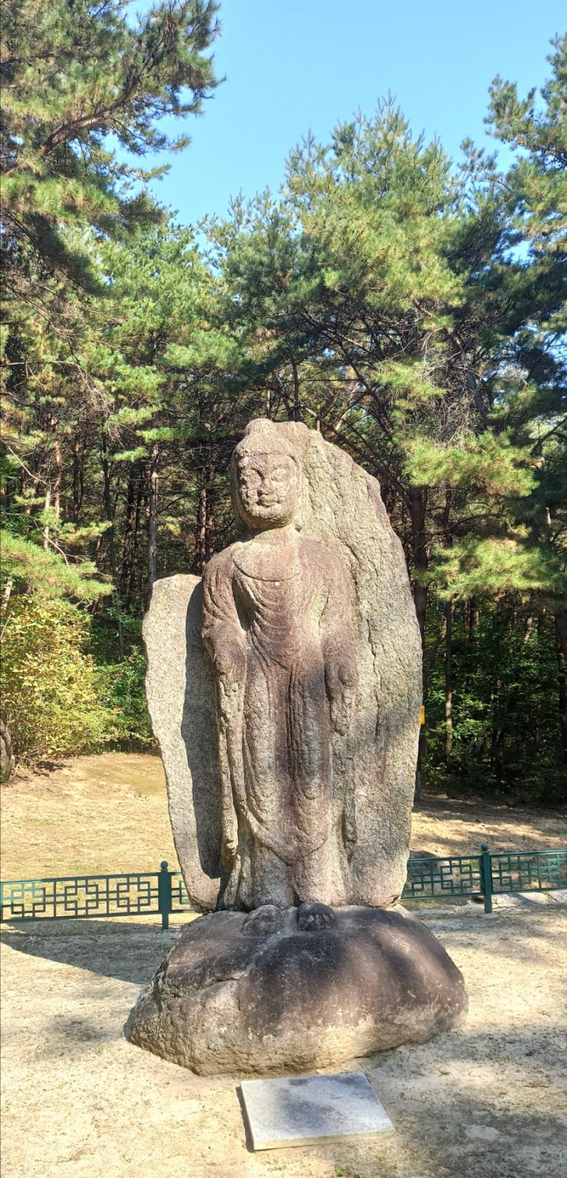 내방객에게 등을 돌리고 남쪽을 향해 서 있는 석조여래입상을 보려면 앞으로 30m쯤 걸어가야 한다. 이렇게 한 걸음 한 걸음 불상에 다가가는 순간이 참 좋다. 쑥쑥 자라서 자연담을 만든 키 큰 소나무들이 빙 둘러싼 숲 속 공터의 잘 다듬어진 잔디밭 위를 걸어서 부처님을 알현하러 가는 길은 뭔가 신성한 느낌이 들기도 하고, 보고픈 연인을 만나러 가는 느낌이 들기도 한다.