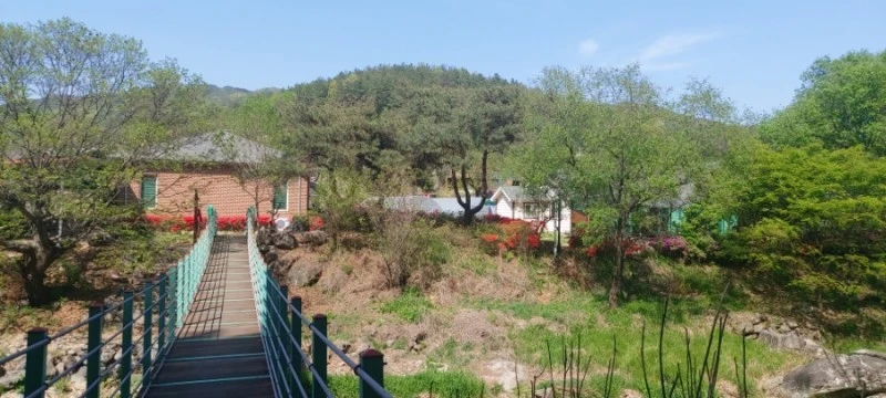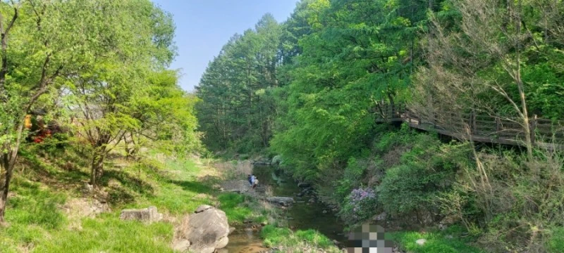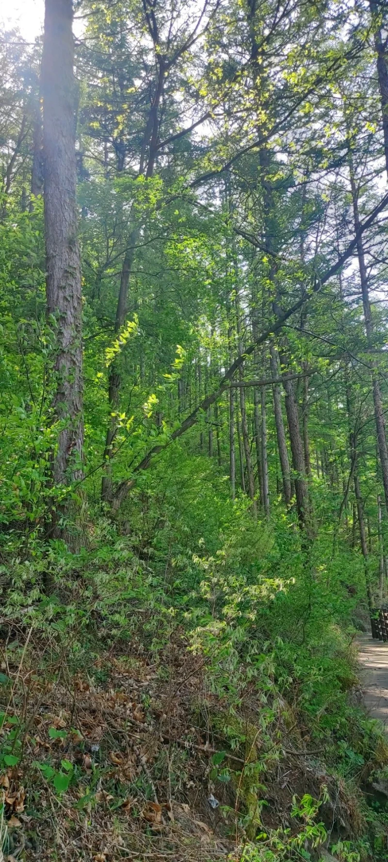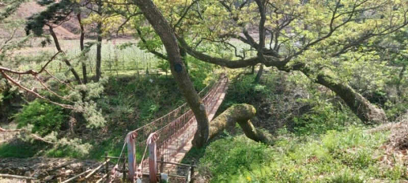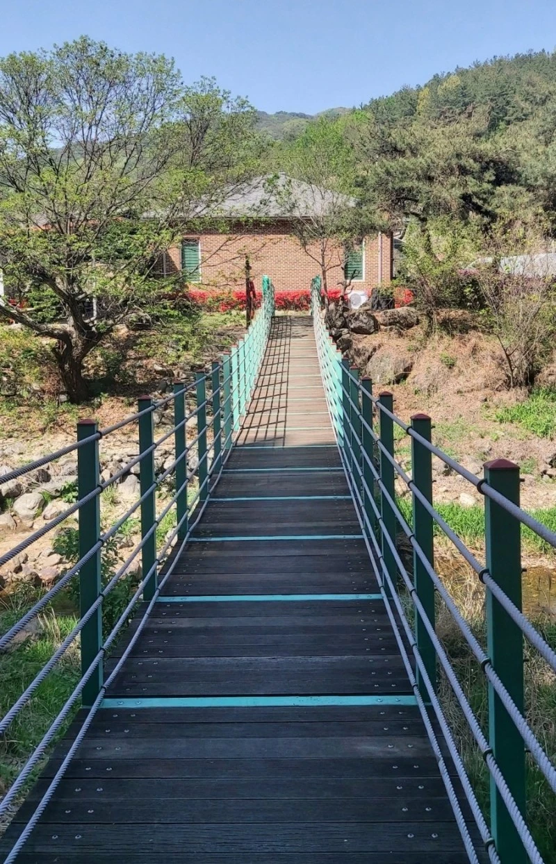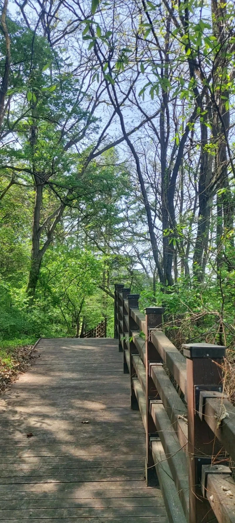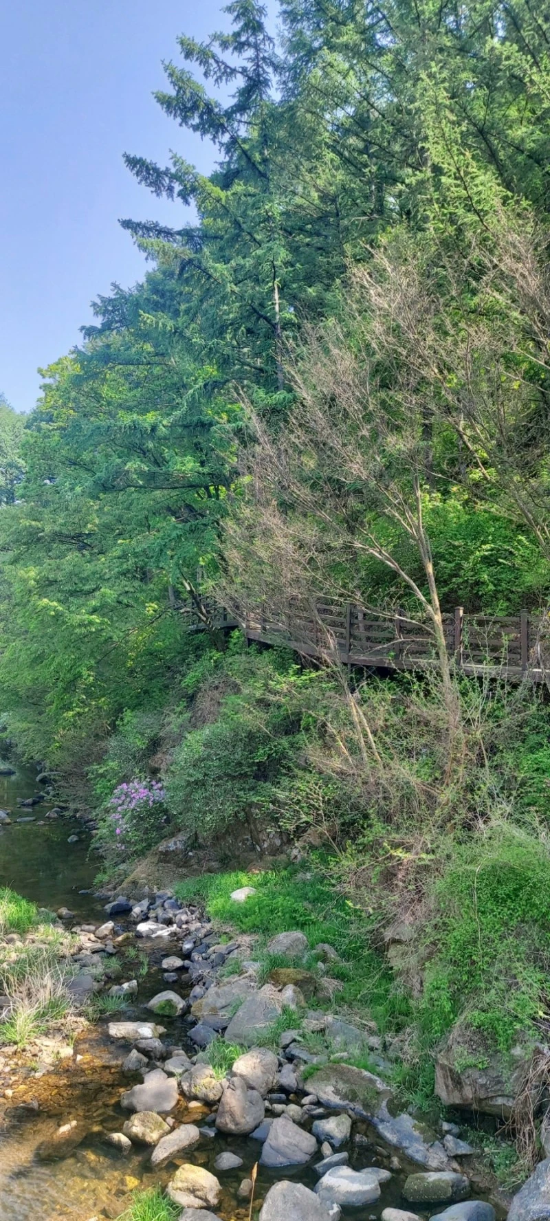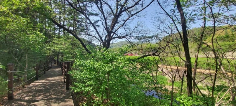 초간정 앞을 흐르는 개울물이 이곳에도 흐르고 있어, 출렁다리 아래에서 벌써 물놀이를 즐기는 가족이 있더라구요. 우린 30m길이의 출렁다리를 건넌 뒤 산을 따라 난 데크길을 걸었어요. 28도까지 올라 봄치곤 제법 더운 날씨였는데 이 길은 그늘이 져서 시원하더라구요. 다양한 초록빛이 가득하고, 보리수꽃향기가 가득한 숲길을 호젓하니 걸을 수 있어 참 좋았어요.